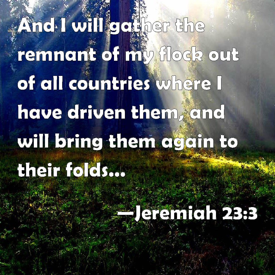 Choose a Background Jeremiah 23:3 And I will gather the remnant of my flock out of all countries where I have driven them, and will bring them again to their folds; and they shall be fruitful and increase. KJV: And I will gather the remnant of my flock out of all countries whither I have driven them, and will bring them again to their folds; and they shall be fruitful and increase. DRB: And I will gather together the remnant of my flock, out of all the lands into which I have cast them out: and I will make them return to their own fields, and they shall increase and be multiplied. DBT: And I will gather the remnant of my flock out of all countries whither I have driven them, and will bring them again to their pastures; and they shall be fruitful and shall multiply. ERV: And I will gather the remnant of my flock out of all the countries whither I have driven them, and will bring them again to their folds; and they shall be fruitful and multiply. WBT: And I will gather the remnant of my flock from all countries whither I have driven them, and will bring them again to their folds; and they shall be fruitful and increase. WEB: I will gather the remnant of my flock out of all the countries where I have driven them, and will bring them again to their folds; and they shall be fruitful and multiply. YLT: And I do gather the remnant of My flock Out of all the lands whither I drove them, And have brought them back unto their fold, And they have been fruitful, and multiplied.Links Jeremiah 23:3 NIV • Jeremiah 23:3 NLT • Jeremiah 23:3 ESV • Jeremiah 23:3 NASB • Jeremiah 23:3 KJV • Jeremiah 23:3 Interlinear • Jeremiah 23:3 Commentaries • Jeremiah 23:3 Parallel Texts • Jeremiah 23:3 Bible Apps • Jeremiah 23:3 Parallel • Bible Hub |