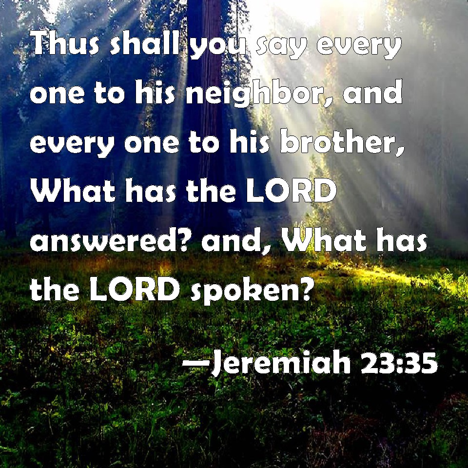 Choose a Background Jeremiah 23:35 Thus shall you say every one to his neighbor, and every one to his brother, What has the LORD answered? and, What has the LORD spoken? KJV: Thus shall ye say every one to his neighbour, and every one to his brother, What hath the LORD answered? and, What hath the LORD spoken? DRB: Thus shall you say every one to his neighbor, and to his brother: What hath the Lord answered? and what hath the Lord spoken? DBT: Thus shall ye say every one to his neighbour, and every one to his brother: What hath Jehovah answered? and, What hath Jehovah spoken? ERV: Thus shall ye say every one to his neighbour, and every one to his brother, What hath the LORD answered? and, What hath the LORD spoken? WBT: Thus shall ye say every one to his neighbor, and every one to his brother, What hath the LORD answered? and, What hath the LORD spoken? WEB: You shall say everyone to his neighbor, and everyone to his brother, What has Yahweh answered? and, What has Yahweh spoken? YLT: Thus do ye say each unto his neighbour, And each unto his brother: What hath Jehovah answered? And what hath Jehovah spoken?Links Jeremiah 23:35 NIV • Jeremiah 23:35 NLT • Jeremiah 23:35 ESV • Jeremiah 23:35 NASB • Jeremiah 23:35 KJV • Jeremiah 23:35 Interlinear • Jeremiah 23:35 Commentaries • Jeremiah 23:35 Parallel Texts • Jeremiah 23:35 Bible Apps • Jeremiah 23:35 Parallel • Bible Hub |