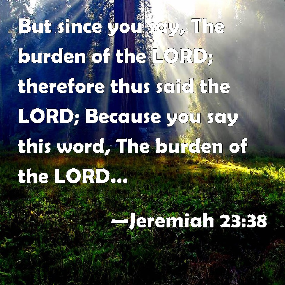 Choose a Background Jeremiah 23:38 But since you say, The burden of the LORD; therefore thus said the LORD; Because you say this word, The burden of the LORD, and I have sent to you, saying, You shall not say, The burden of the LORD; KJV: But since ye say, The burden of the LORD; therefore thus saith the LORD; Because ye say this word, The burden of the LORD, and I have sent unto you, saying, Ye shall not say, The burden of the LORD; DRB: But if you shall say: The burden of the Lord: therefore thus saith the Lord: Because you have said this word: The burden of the Lord: and I have sent to you saying: Say not, Tne burden of the Lord: DBT: But since ye say, The burden of Jehovah, therefore thus saith Jehovah: Because ye say this word, The burden of Jehovah, and I have sent unto you, saying, Ye shall not say, The burden of Jehovah; ERV: But if ye say, The burden of the LORD; therefore thus saith the LORD: Because ye say this word, The burden of the LORD, and I have sent unto you, saying, Ye shall not say, The burden of the LORD; WBT: But since ye say, The burden of the LORD; therefore thus saith the LORD; Because ye say this word, The burden of the LORD, and I have sent to you, saying, Ye shall not say, The burden of the LORD; WEB: But if you say, The burden of Yahweh; therefore thus says Yahweh: Because you say this word, The burden of Yahweh, and I have sent to you, saying, You shall not say, The burden of Yahweh; YLT: And if the burden of Jehovah ye say, Therefore thus said Jehovah: Because of your saying this word, The burden of Jehovah, And I do send unto you, saying, Ye do not say, The burden of Jehovah.Links Jeremiah 23:38 NIV • Jeremiah 23:38 NLT • Jeremiah 23:38 ESV • Jeremiah 23:38 NASB • Jeremiah 23:38 KJV • Jeremiah 23:38 Interlinear • Jeremiah 23:38 Commentaries • Jeremiah 23:38 Parallel Texts • Jeremiah 23:38 Bible Apps • Jeremiah 23:38 Parallel • Bible Hub |