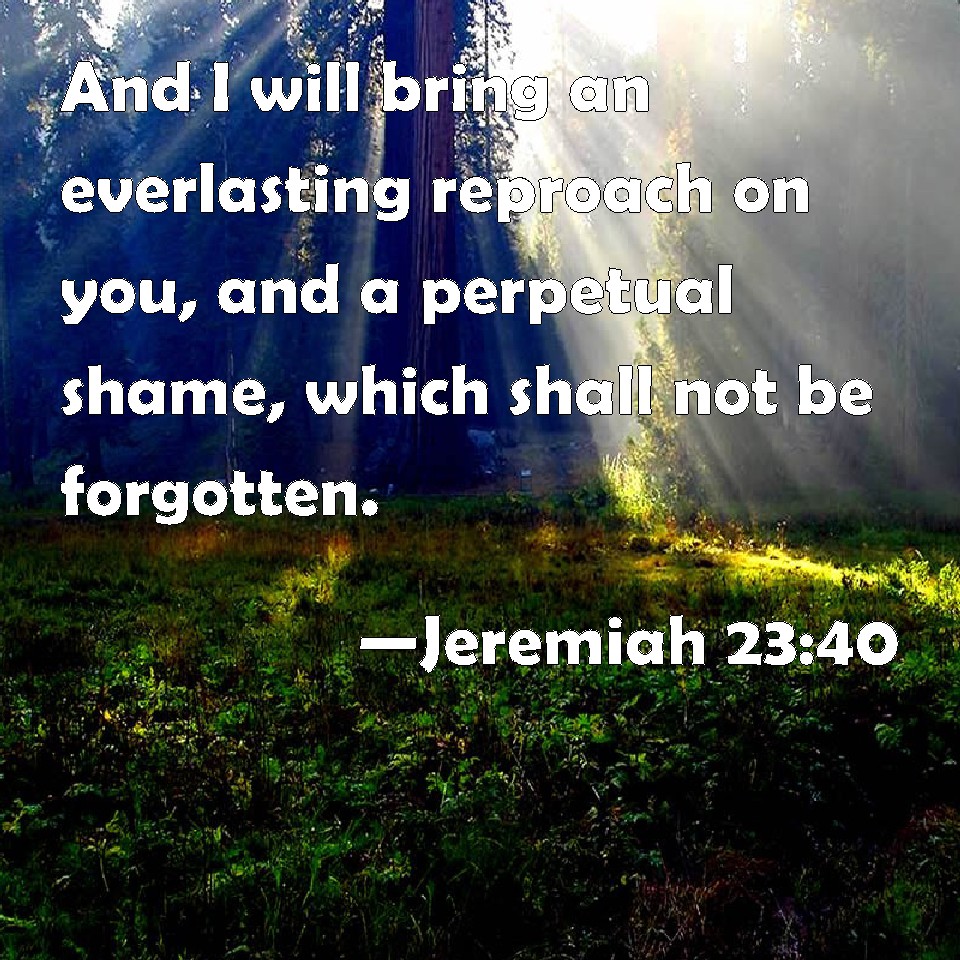 Choose a Background Jeremiah 23:40 And I will bring an everlasting reproach on you, and a perpetual shame, which shall not be forgotten. KJV: And I will bring an everlasting reproach upon you, and a perpetual shame, which shall not be forgotten. DRB: And I will bring an everlasting reproach upon you, and a perpetual shame which shall never be forgotten. DBT: And I will bring everlasting reproach upon you, and everlasting shame, that shall not be forgotten. ERV: and I will bring an everlasting reproach upon you, and a perpetual shame which shall not be forgotten. WBT: And I will bring an everlasting reproach upon you, and a perpetual shame, which shall not be forgotten. WEB: and I will bring an everlasting reproach on you, and a perpetual shame, which shall not be forgotten. YLT: And I have put on you reproach age-during, And shame age-during that is not forgotten!Links Jeremiah 23:40 NIV • Jeremiah 23:40 NLT • Jeremiah 23:40 ESV • Jeremiah 23:40 NASB • Jeremiah 23:40 KJV • Jeremiah 23:40 Interlinear • Jeremiah 23:40 Commentaries • Jeremiah 23:40 Parallel Texts • Jeremiah 23:40 Bible Apps • Jeremiah 23:40 Parallel • Bible Hub |