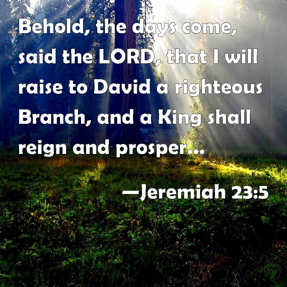 Choose a Background Jeremiah 23:5 Behold, the days come, said the LORD, that I will raise to David a righteous Branch, and a King shall reign and prosper, and shall execute judgment and justice in the earth. KJV: Behold, the days come, saith the LORD, that I will raise unto David a righteous Branch, and a King shall reign and prosper, and shall execute judgment and justice in the earth. DRB: Behold the days come, saith the Lord, and I will raise up to David a just branch: and a king shall reign, and shall be wise, and shall execute judgement and justice in the earth. DBT: Behold, the days come, saith Jehovah, when I will raise unto David a righteous Branch, who shall reign as king, and act wisely, and shall execute judgment and righteousness in the land. ERV: Behold, the days come, saith the LORD, that I will raise unto David a righteous Branch, and he shall reign as king and deal wisely, and shall execute judgment and justice in the land. WBT: Behold, the days come, saith the LORD, that I will raise to David a righteous Branch, and a King shall reign and prosper, and shall execute judgment and justice upon the earth. WEB: Behold, the days come, says Yahweh, that I will raise to David a righteous Branch, and he shall reign as king and deal wisely, and shall execute justice and righteousness in the land. YLT: Lo, days are coming — an affirmation of Jehovah, And I have raised to David a righteous shoot, And a king hath reigned and acted wisely, And done judgment and righteousness in the earth.Links Jeremiah 23:5 NIV • Jeremiah 23:5 NLT • Jeremiah 23:5 ESV • Jeremiah 23:5 NASB • Jeremiah 23:5 KJV • Jeremiah 23:5 Interlinear • Jeremiah 23:5 Commentaries • Jeremiah 23:5 Parallel Texts • Jeremiah 23:5 Bible Apps • Jeremiah 23:5 Parallel • Bible Hub |