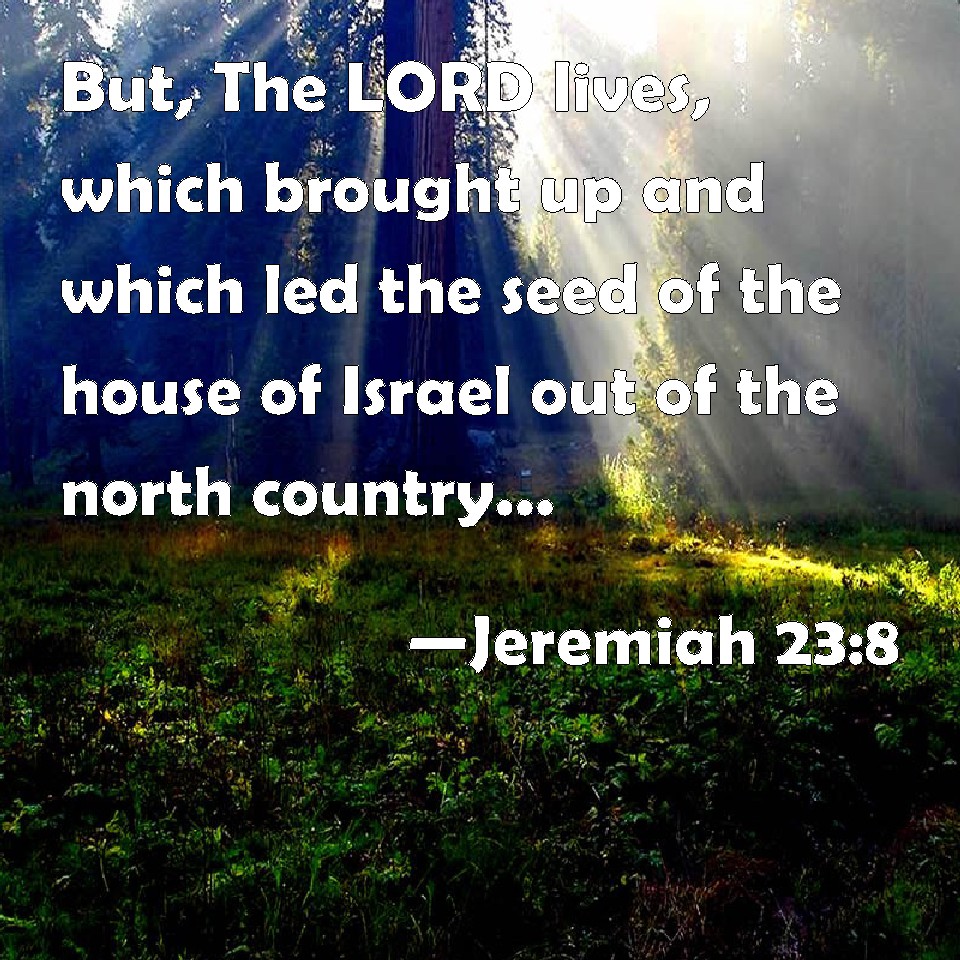 Choose a Background Jeremiah 23:8 But, The LORD lives, which brought up and which led the seed of the house of Israel out of the north country, and from all countries where I had driven them; and they shall dwell in their own land. KJV: But, The LORD liveth, which brought up and which led the seed of the house of Israel out of the north country, and from all countries whither I had driven them; and they shall dwell in their own land. DRB: But the Lord liveth, who hath brought out, and brought hither the seed of the house of Israel from the land of the north, and out of all the lands, to which I had cast them forth: and they shall dwell in their own land. DBT: but, As Jehovah liveth, who brought up and who led back the seed of the house of Israel out of the north country, and from all countries whither I had driven them. And they shall dwell in their own land. ERV: but, As the LORD liveth, which brought up and which led the seed of the house of Israel out of the north country, and from all the countries whither I had driven them; and they shall dwell in their own land. WBT: But, the LORD liveth, who brought and who led the seed of the house of Israel out of the north country, and from all countries whither I have driven them; and they shall dwell in their own land. WEB: but, As Yahweh lives, who brought up and who led the seed of the house of Israel out of the north country, and from all the countries where I had driven them. They shall dwell in their own land. YLT: But — Jehovah liveth, who brought up, And who brought in, the seed of the house of Israel, From the land of the north, And from all the lands whither I drove them, And they have dwelt on their own ground!Links Jeremiah 23:8 NIV • Jeremiah 23:8 NLT • Jeremiah 23:8 ESV • Jeremiah 23:8 NASB • Jeremiah 23:8 KJV • Jeremiah 23:8 Interlinear • Jeremiah 23:8 Commentaries • Jeremiah 23:8 Parallel Texts • Jeremiah 23:8 Bible Apps • Jeremiah 23:8 Parallel • Bible Hub |