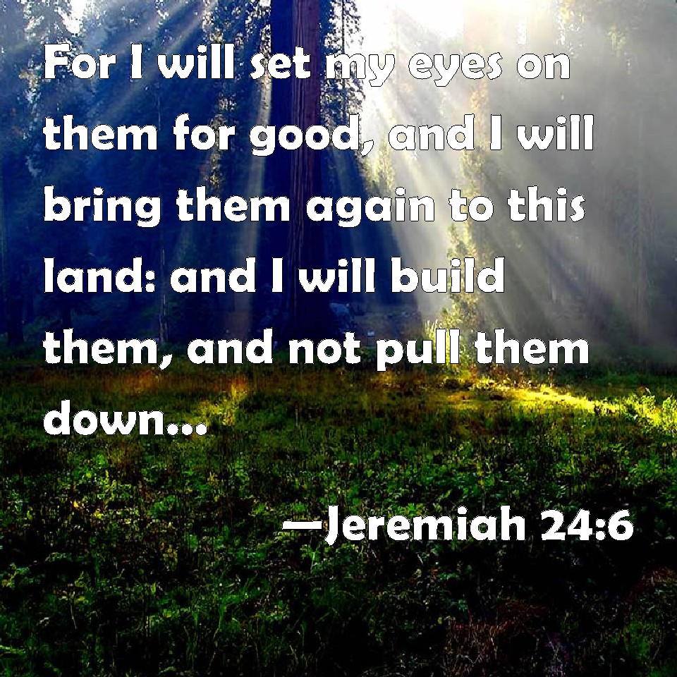Choose a Background Jeremiah 24:6 For I will set my eyes on them for good, and I will bring them again to this land: and I will build them, and not pull them down; and I will plant them, and not pluck them up. KJV: For I will set mine eyes upon them for good, and I will bring them again to this land: and I will build them, and not pull them down; and I will plant them, and not pluck them up. DRB: And I will set my eyes upon them to be pacified, and I will bring them again into this land: and I will be their God: and I will build them up, and not pull them down: and I will plant them, and not pluck them up. DBT: and I will set mine eyes upon them for good, and I will bring them again to this land; and I will build them and not pull them down, and I will plant them and not pluck them up. ERV: For I will set mine eyes upon them for good, and I will bring them again to this land: and I will build them, and not pull them down; and I will plant them, and not pluck them up. WBT: For I will set my eyes upon them for good, and I will bring them again to this land: and I will build them, and not pull them down; and I will plant them, and not pluck them up. WEB: For I will set my eyes on them for good, and I will bring them again to this land: and I will build them, and not pull them down; and I will plant them, and not pluck them up. YLT: And I have set Mine eyes on them for good, And have brought them back to this land, And built them up, and I throw not down, And have planted them, and pluck not up.Links Jeremiah 24:6 NIV • Jeremiah 24:6 NLT • Jeremiah 24:6 ESV • Jeremiah 24:6 NASB • Jeremiah 24:6 KJV • Jeremiah 24:6 Interlinear • Jeremiah 24:6 Commentaries • Jeremiah 24:6 Parallel Texts • Jeremiah 24:6 Bible Apps • Jeremiah 24:6 Parallel • Bible Hub |