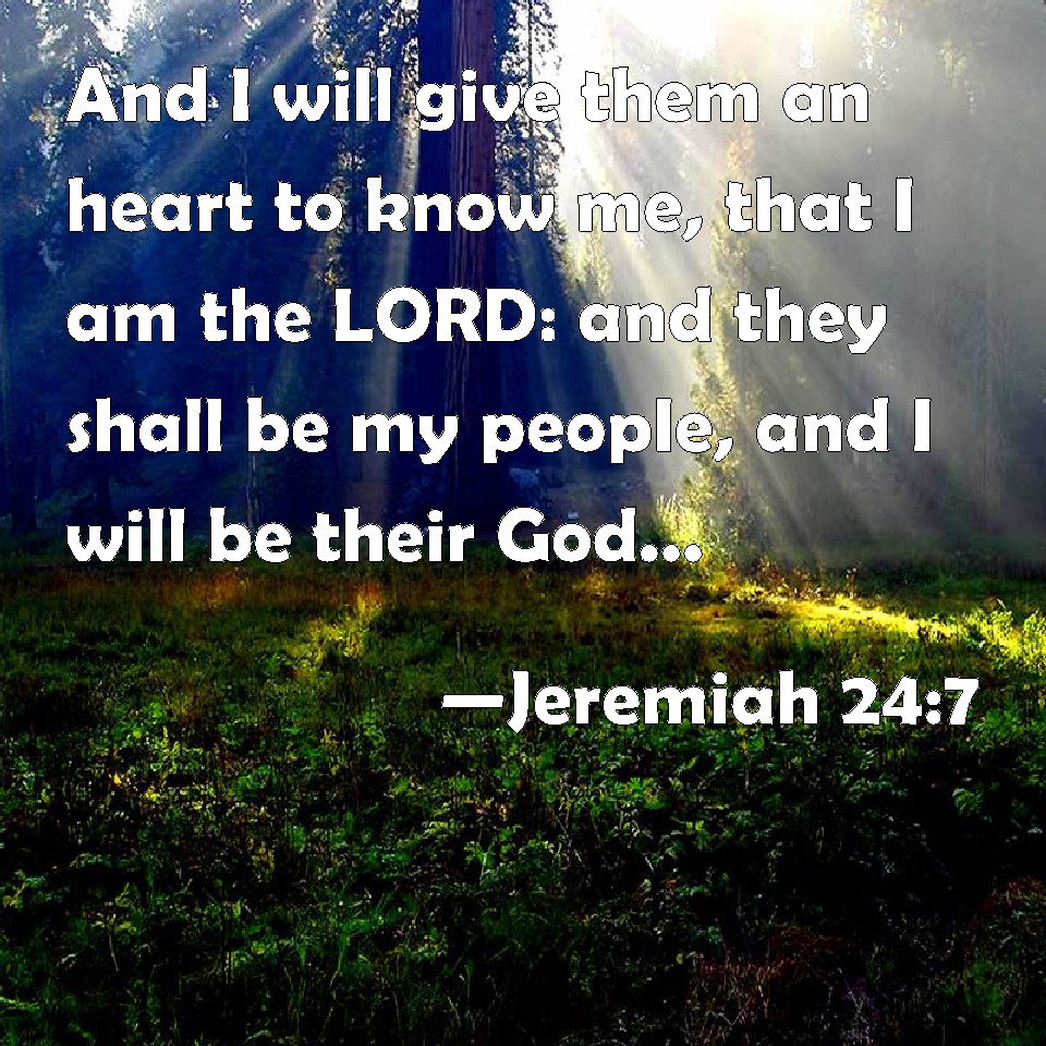 Jeremiah 24:7 And I will give them an heart to know me, that I am the LORD: and they shall be my people, and I will be their God: for they shall return to me with their whole heart.