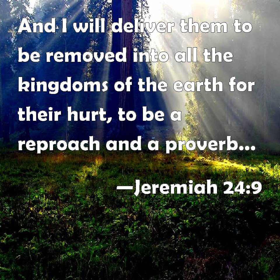 Choose a Background Jeremiah 24:9 And I will deliver them to be removed into all the kingdoms of the earth for their hurt, to be a reproach and a proverb, a taunt and a curse, in all places where I shall drive them. KJV: And I will deliver them to be removed into all the kingdoms of the earth for their hurt, to be a reproach and a proverb, a taunt and a curse, in all places whither I shall drive them. DRB: And I will deliver them up to vexation, and affliction, to all the kingdoms of the earth: to be a reproach, and a byword, and a proverb, and to be a curse in all places, to which I have cast them out. DBT: And I will give them over to be driven hither and thither unto all the kingdoms of the earth for evil, to be a reproach and a proverb, a taunt and a curse, in all places whither I shall drive them; ERV: I will even give them up to be tossed to and fro among all the kingdoms of the earth for evil; to be a reproach and a proverb, a taunt and a curse, in all places whither I shall drive them. WBT: And I will deliver them to be removed into all the kingdoms of the earth for their hurt, to be a reproach and a proverb, a taunt and a curse, in all places whither I shall drive them. WEB: I will even give them up to be tossed back and forth among all the kingdoms of the earth for evil; to be a reproach and a proverb, a taunt and a curse, in all places where I shall drive them. YLT: And I have given them for a trembling, For evil — to all kingdoms of the earth, For a reproach, and for a simile, For a byword, and for a reviling, In all the places whither I drive them.Links Jeremiah 24:9 NIV • Jeremiah 24:9 NLT • Jeremiah 24:9 ESV • Jeremiah 24:9 NASB • Jeremiah 24:9 KJV • Jeremiah 24:9 Interlinear • Jeremiah 24:9 Commentaries • Jeremiah 24:9 Parallel Texts • Jeremiah 24:9 Bible Apps • Jeremiah 24:9 Parallel • Bible Hub |