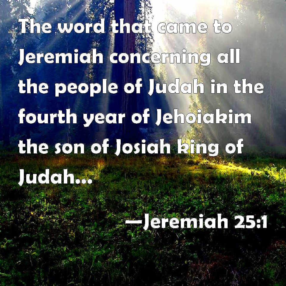 Choose a Background Jeremiah 25:1 The word that came to Jeremiah concerning all the people of Judah in the fourth year of Jehoiakim the son of Josiah king of Judah, that was the first year of Nebuchadrezzar king of Babylon; KJV: The word that came to Jeremiah concerning all the people of Judah in the fourth year of Jehoiakim the son of Josiah king of Judah, that was the first year of Nebuchadrezzar king of Babylon; DRB: The word that came to Jeremias concerning all the people of Juda, in the fourth year of Joakim the son of Josias king of Juda, (the same is the first year of Nabuchodonosor king of Babylon,) DBT: The word that came to Jeremiah concerning all the people of Judah, in the fourth year of Jehoiakim the son of Josiah, the king of Judah (that is, the first year of Nebuchadrezzar king of Babylon), ERV: The word that came to Jeremiah concerning all the people of Judah in the fourth year of Jehoiakim the son of Josiah, king of Judah; the same was the first year of Nebuchadrezzar king of Babylon; WBT: The word that came to Jeremiah concerning all the people of Judah in the fourth year of Jehoiakim the son of Josiah king of Judah, that was the first year of Nebuchadrezzar king of Babylon; WEB: The word that came to Jeremiah concerning all the people of Judah, in the fourth year of Jehoiakim the son of Josiah, king of Judah (the same was the first year of Nebuchadnezzar king of Babylon), YLT: The word that hath been unto Jeremiah concerning all the people of Judah, in the fourth year of Jehoiakim son of Josiah king of Judah, — it is the first year of Nebuchadrezzar king of Babylon, — Links Jeremiah 25:1 NIV • Jeremiah 25:1 NLT • Jeremiah 25:1 ESV • Jeremiah 25:1 NASB • Jeremiah 25:1 KJV • Jeremiah 25:1 Interlinear • Jeremiah 25:1 Commentaries • Jeremiah 25:1 Parallel Texts • Jeremiah 25:1 Bible Apps • Jeremiah 25:1 Parallel • Bible Hub |