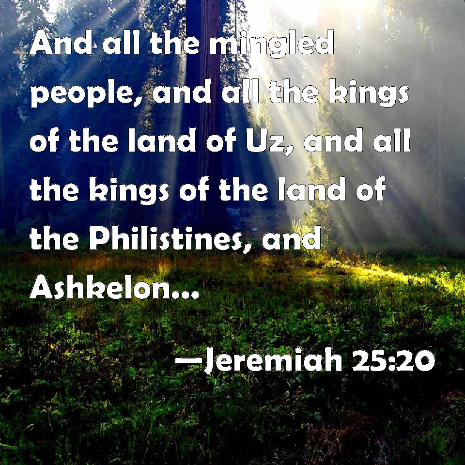 Jeremiah 25:20 And all the mingled people, and all the kings of the land of Uz, and all the kings of the land of the Philistines, and Ashkelon, and Azzah, and Ekron, and the remnant of Ashdod,