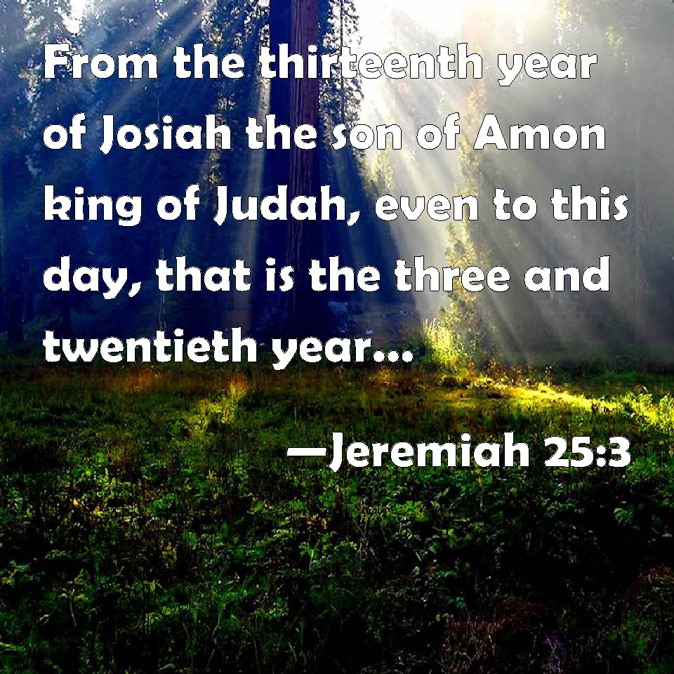 Choose a Background Jeremiah 25:3 From the thirteenth year of Josiah the son of Amon king of Judah, even to this day, that is the three and twentieth year, the word of the LORD has come to me, and I have spoken to you, rising early and speaking; but you have not listened. KJV: From the thirteenth year of Josiah the son of Amon king of Judah, even unto this day, that is the three and twentieth year, the word of the LORD hath come unto me, and I have spoken unto you, rising early and speaking; but ye have not hearkened. DRB: From the thirteenth year of Josias the son of Ammon king of Juda until this day: this is the three and twentieth year, the word of the Lord hath come to me, and I have spoken to you, rising before day, and speaking, and you have not hearkened. DBT: From the thirteenth year of Josiah the son of Amon, the king of Judah, even unto this day, these three and twenty years, the word of Jehovah hath come unto me, and I have spoken unto you, rising early and speaking; but ye have not hearkened. ERV: From the thirteenth year of Josiah the son of Amon, king of Judah, even unto this day, these three and twenty years, the word of the LORD hath come unto me, and I have spoken unto you, rising up early and speaking; but ye have not hearkened. WBT: From the thirteenth year of Josiah the son of Amon king of Judah, even to this day, that is the three and twentieth year, the word of the LORD hath come to me, and I have spoken to you, rising early and speaking; but ye have not hearkened. WEB: From the thirteenth year of Josiah the son of Amon, king of Judah, even to this day, these twenty-three years, the word of Yahweh has come to me, and I have spoken to you, rising up early and speaking; but you have not listened. YLT: From the thirteenth year of Josiah son of Amon king of Judah, and unto this day — this three and twentieth year — hath the word of Jehovah been unto me, and I speak unto you, rising early and speaking, and ye have not hearkened;Links Jeremiah 25:3 NIV • Jeremiah 25:3 NLT • Jeremiah 25:3 ESV • Jeremiah 25:3 NASB • Jeremiah 25:3 KJV • Jeremiah 25:3 Interlinear • Jeremiah 25:3 Commentaries • Jeremiah 25:3 Parallel Texts • Jeremiah 25:3 Bible Apps • Jeremiah 25:3 Parallel • Bible Hub |