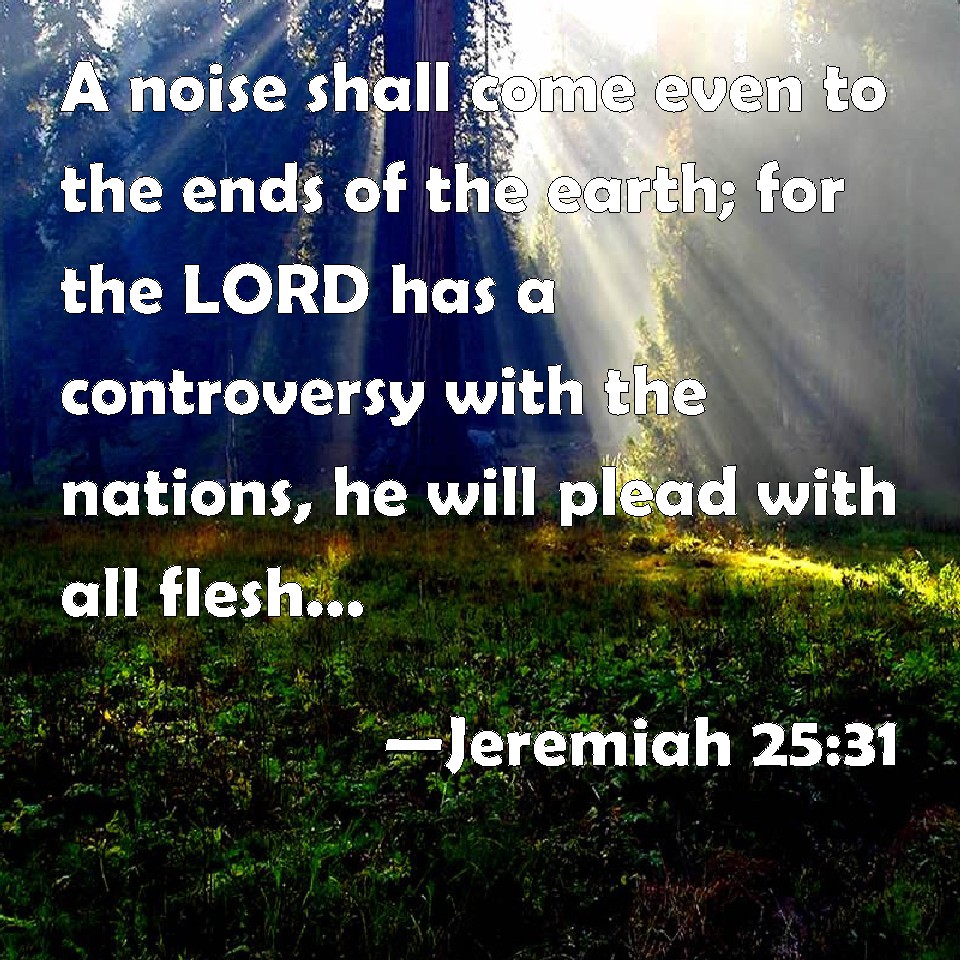 Choose a Background Jeremiah 25:31 A noise shall come even to the ends of the earth; for the LORD has a controversy with the nations, he will plead with all flesh; he will give them that are wicked to the sword, said the LORD. KJV: A noise shall come even to the ends of the earth; for the LORD hath a controversy with the nations, he will plead with all flesh; he will give them that are wicked to the sword, saith the LORD. DRB: The noise is come even to the ends of the earth: for the Lord entereth into judgement with the nations: he entereth into judgement with all flesh; the wicked I have delivered up to the sword, saith the Lord. DBT: The noise shall come to the end of the earth: for Jehovah hath a controversy with the nations, he entereth into judgment with all flesh; as for the wicked, he will give them up to the sword, saith Jehovah. ERV: A noise shall come even to the end of the earth; for the LORD hath a controversy with the nations, he will plead with all flesh; as for the wicked, he will give them to the sword, saith the LORD. WBT: A noise shall come even to the ends of the earth; for the LORD hath a controversy with the nations, he will plead with all flesh; he will give them that are wicked to the sword, saith the LORD. WEB: A noise shall come even to the end of the earth; for Yahweh has a controversy with the nations; he will enter into judgment with all flesh: as for the wicked, he will give them to the sword, says Yahweh. YLT: Wasting hath come unto the end of the earth, For a controversy hath Jehovah with nations, He hath executed judgment for all flesh, The wicked! He hath given them to the sword, An affirmation of Jehovah.Links Jeremiah 25:31 NIV • Jeremiah 25:31 NLT • Jeremiah 25:31 ESV • Jeremiah 25:31 NASB • Jeremiah 25:31 KJV • Jeremiah 25:31 Interlinear • Jeremiah 25:31 Commentaries • Jeremiah 25:31 Parallel Texts • Jeremiah 25:31 Bible Apps • Jeremiah 25:31 Parallel • Bible Hub |