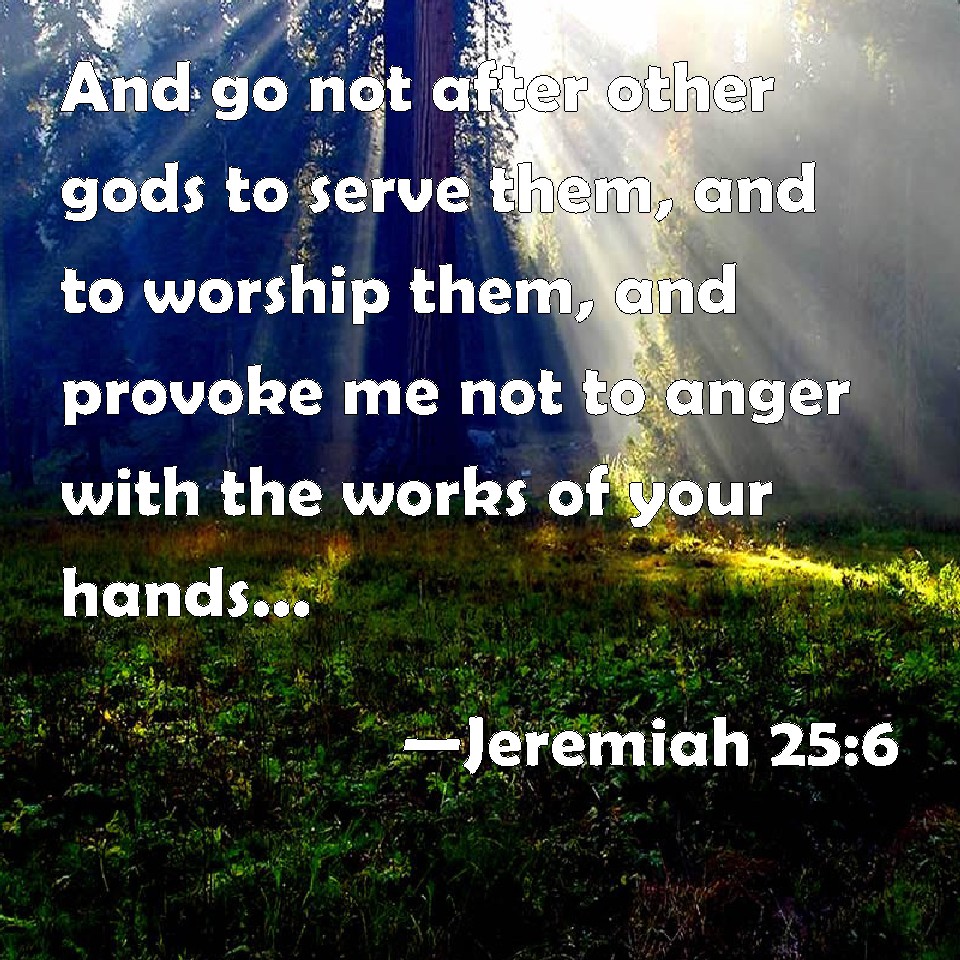 Choose a Background Jeremiah 25:6 And go not after other gods to serve them, and to worship them, and provoke me not to anger with the works of your hands; and I will do you no hurt. KJV: And go not after other gods to serve them, and to worship them, and provoke me not to anger with the works of your hands; and I will do you no hurt. DRB: And go not after strange gods to serve them, and adore them: nor provoke me to wrath by the works of your hands, and I will not afflict you. DBT: And go not after other gods, to serve them and to worship them; and provoke me not to anger with the work of your hands; and I will do you no hurt. ERV: and go not after other gods to serve them, and to worship them, and provoke me not to anger with the work of your hands; and I will do you no hurt. WBT: And go not after other gods to serve them, and to worship them, and provoke me not to anger with the works of your hands; and I will do you no hurt. WEB: and don't go after other gods to serve them or worship them, and don't provoke me to anger with the work of your hands; and I will do you no harm. YLT: And ye do not go after other gods to serve them, and to bow yourselves to them, nor do ye provoke Me to anger with the work of your hands, and I do no evil to you;Links Jeremiah 25:6 NIV • Jeremiah 25:6 NLT • Jeremiah 25:6 ESV • Jeremiah 25:6 NASB • Jeremiah 25:6 KJV • Jeremiah 25:6 Interlinear • Jeremiah 25:6 Commentaries • Jeremiah 25:6 Parallel Texts • Jeremiah 25:6 Bible Apps • Jeremiah 25:6 Parallel • Bible Hub |