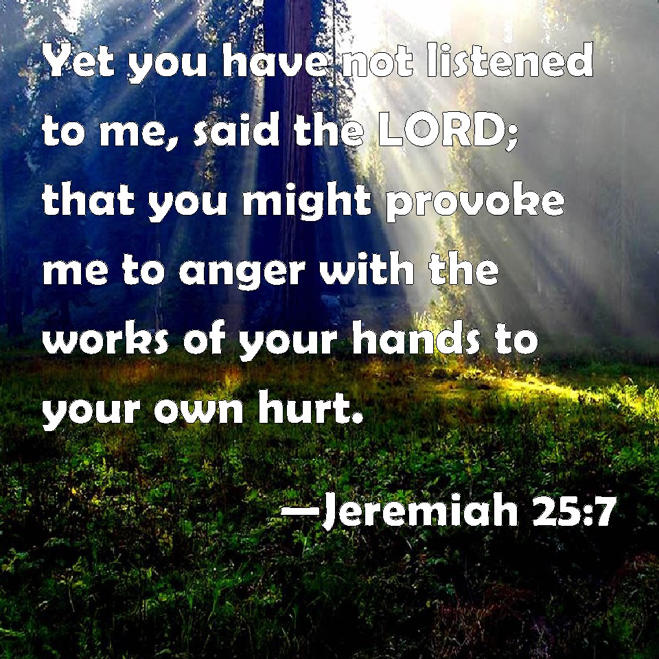 Choose a Background Jeremiah 25:7 Yet you have not listened to me, said the LORD; that you might provoke me to anger with the works of your hands to your own hurt. KJV: Yet ye have not hearkened unto me, saith the LORD; that ye might provoke me to anger with the works of your hands to your own hurt. DRB: And you have not heard me, saith the Lord, that you might provoke me to anger with the works of your hands, to your own hurt. DBT: But ye have not hearkened unto me, saith Jehovah; that ye might provoke me to anger with the work of your hands, to your own hurt. ERV: Yet ye have not hearkened unto me, saith the LORD; that ye might provoke me to anger with the work of your hands to your own hurt. WBT: Yet ye have not hearkened to me, saith the LORD; that ye might provoke me to anger with the works of your hands to your own hurt. WEB: Yet you have not listened to me, says Yahweh; that you may provoke me to anger with the work of your hands to your own hurt. YLT: And ye have not hearkened unto Me — an affirmation of Jehovah — so as to provoke Me to anger with the work of your hands for evil to you.Links Jeremiah 25:7 NIV • Jeremiah 25:7 NLT • Jeremiah 25:7 ESV • Jeremiah 25:7 NASB • Jeremiah 25:7 KJV • Jeremiah 25:7 Interlinear • Jeremiah 25:7 Commentaries • Jeremiah 25:7 Parallel Texts • Jeremiah 25:7 Bible Apps • Jeremiah 25:7 Parallel • Bible Hub |