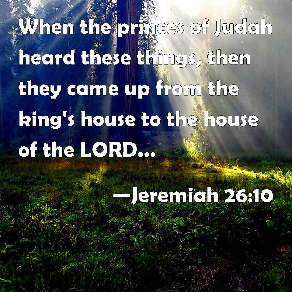 Choose a Background Jeremiah 26:10 When the princes of Judah heard these things, then they came up from the king's house to the house of the LORD, and sat down in the entry of the new gate of the LORD's house. KJV: When the princes of Judah heard these things, then they came up from the king's house unto the house of the LORD, and sat down in the entry of the new gate of the LORD'S house. DRB: And the princes of Juda heard these words: and they went up from the king's house into the house of the Lord, and sat in the entry of the new gate of the house of the Lord. DBT: And the princes of Judah heard these things; and they went up from the king's house unto the house of Jehovah, and sat in the entry of the new gate of Jehovah. ERV: And when the princes of Judah heard these things, they came up from the king's house unto the house of the LORD; and they sat in the entry of the new gate of the LORD'S house. WBT: When the princes of Judah heard these things, then they came up from the king's house to the house of the LORD, and sat down in the entry of the new gate of the LORD'S house. WEB: When the princes of Judah heard these things, they came up from the king's house to the house of Yahweh; and they sat in the entry of the new gate of Yahweh's [house]. YLT: And the heads of Judah hear these things, and they go up from the house of the king to the house of Jehovah, and sit in the opening of the new gate of Jehovah.Links Jeremiah 26:10 NIV • Jeremiah 26:10 NLT • Jeremiah 26:10 ESV • Jeremiah 26:10 NASB • Jeremiah 26:10 KJV • Jeremiah 26:10 Interlinear • Jeremiah 26:10 Commentaries • Jeremiah 26:10 Parallel Texts • Jeremiah 26:10 Bible Apps • Jeremiah 26:10 Parallel • Bible Hub |