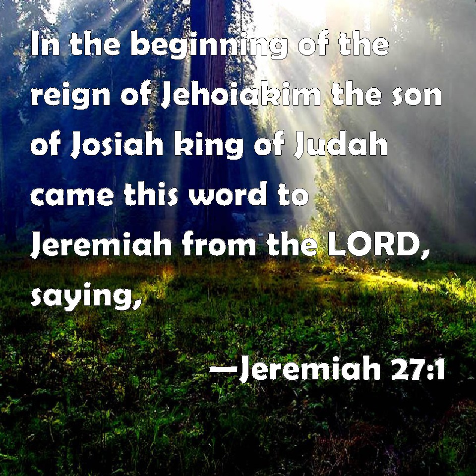 Choose a Background Jeremiah 27:1 In the beginning of the reign of Jehoiakim the son of Josiah king of Judah came this word to Jeremiah from the LORD, saying, KJV: In the beginning of the reign of Jehoiakim the son of Josiah king of Judah came this word unto Jeremiah from the LORD, saying, DRB: In the beginning of the reign of Joakim the son of Josias king of Juda, this word came to Jeremias from the Lord, saying: DBT: In the beginning of the reign of Jehoiakim the son of Josiah, the king of Judah, came this word to Jeremiah from Jehovah, saying, ERV: In the beginning of the reign of Jehoiakim the son of Josiah, king of Judah, came this word unto Jeremiah from the LORD, saying, WBT: In the beginning of the reign of Jehoiakim the son of Josiah king of Judah, came this word to Jeremiah from the LORD, saying, WEB: In the beginning of the reign of Jehoiakim the son of Josiah, king of Judah, came this word to Jeremiah from Yahweh, saying, YLT: In the beginning of the reign of Jehoiakim son of Josiah, king of Judah, hath this word been unto Jeremiah from Jehovah, saying,Links Jeremiah 27:1 NIV • Jeremiah 27:1 NLT • Jeremiah 27:1 ESV • Jeremiah 27:1 NASB • Jeremiah 27:1 KJV • Jeremiah 27:1 Interlinear • Jeremiah 27:1 Commentaries • Jeremiah 27:1 Parallel Texts • Jeremiah 27:1 Bible Apps • Jeremiah 27:1 Parallel • Bible Hub |