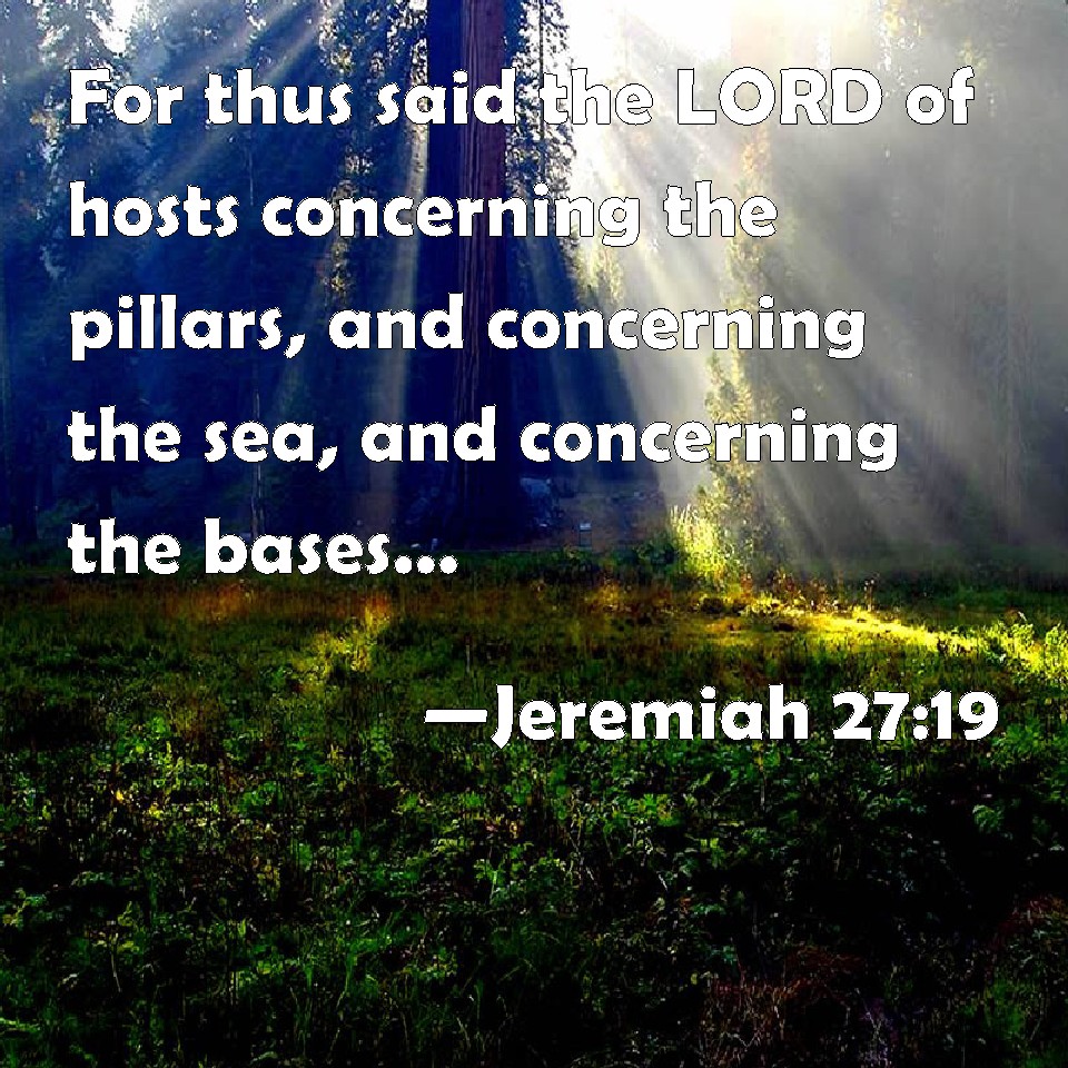 Choose a Background Jeremiah 27:19 For thus said the LORD of hosts concerning the pillars, and concerning the sea, and concerning the bases, and concerning the residue of the vessels that remain in this city. KJV: For thus saith the LORD of hosts concerning the pillars, and concerning the sea, and concerning the bases, and concerning the residue of the vessels that remain in this city, DRB: For thus saith the Lord of hosts d to the pillars, and to the sea, and to the bases, and to the rest of the vessels that remain in this city: DBT: For thus saith Jehovah of hosts concerning the pillars, and concerning the sea, and concerning the bases, and concerning the rest of the vessels that are left in this city, ERV: For thus saith the LORD of hosts concerning the pillars, and concerning the sea, and concerning the bases, and concerning the residue of the vessels, that are left in this city, WBT: For thus saith the LORD of hosts concerning the pillars, and concerning the sea, and concerning the bases, and concerning the residue of the vessels that remain in this city, WEB: For thus says Yahweh of Armies concerning the pillars, and concerning the sea, and concerning the bases, and concerning the residue of the vessels that are left in this city, YLT: For thus said Jehovah of Hosts concerning the pillars, and concerning the sea, and concerning the bases, and concerning the rest of the vessels that are left in this city,Links Jeremiah 27:19 NIV • Jeremiah 27:19 NLT • Jeremiah 27:19 ESV • Jeremiah 27:19 NASB • Jeremiah 27:19 KJV • Jeremiah 27:19 Interlinear • Jeremiah 27:19 Commentaries • Jeremiah 27:19 Parallel Texts • Jeremiah 27:19 Bible Apps • Jeremiah 27:19 Parallel • Bible Hub |