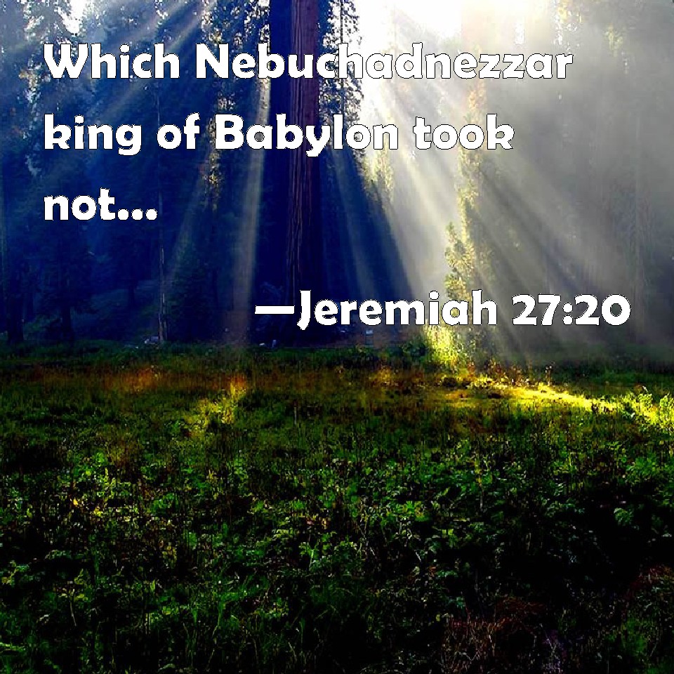 Choose a Background Jeremiah 27:20 Which Nebuchadnezzar king of Babylon took not, when he carried away captive Jeconiah the son of Jehoiakim king of Judah from Jerusalem to Babylon, and all the nobles of Judah and Jerusalem; KJV: Which Nebuchadnezzar king of Babylon took not, when he carried away captive Jeconiah the son of Jehoiakim king of Judah from Jerusalem to Babylon, and all the nobles of Judah and Jerusalem; DRB: Which Nabuchodonosor the king of Babylon did not take, when he carried away Jechonias the son of Joakim the king of Juda, from Jerusalem to Babylon, and all the great men of Juda and Jerusalem. DBT: which Nebuchadnezzar king of Babylon took not, when he carried away captive Jeconiah the son of Jehoiakim, the king of Judah, from Jerusalem to Babylon, along with all the nobles of Judah and Jerusalem; ERV: which Nebuchadnezzar king of Babylon took not, when he carried away captive Jeconiah the son of Jehoiakim, king of Judah, from Jerusalem to Babylon, and all the nobles of Judah and Jerusalem; WBT: Which Nebuchadnezzar king of Babylon took not, when he carried away captive Jeconiah the son of Jehoiakim king of Judah from Jerusalem to Babylon, and all the nobles of Judah and Jerusalem; WEB: which Nebuchadnezzar king of Babylon didn't take, when he carried away captive Jeconiah the son of Jehoiakim, king of Judah, from Jerusalem to Babylon, and all the nobles of Judah and Jerusalem; YLT: That Nebuchadnezzar king of Babylon hath not taken, in his removing Jeconiah son of Jehoiakim king of Judah from Jerusalem to Babylon with all the freemen of Judah and Jerusalem,Links Jeremiah 27:20 NIV • Jeremiah 27:20 NLT • Jeremiah 27:20 ESV • Jeremiah 27:20 NASB • Jeremiah 27:20 KJV • Jeremiah 27:20 Interlinear • Jeremiah 27:20 Commentaries • Jeremiah 27:20 Parallel Texts • Jeremiah 27:20 Bible Apps • Jeremiah 27:20 Parallel • Bible Hub |