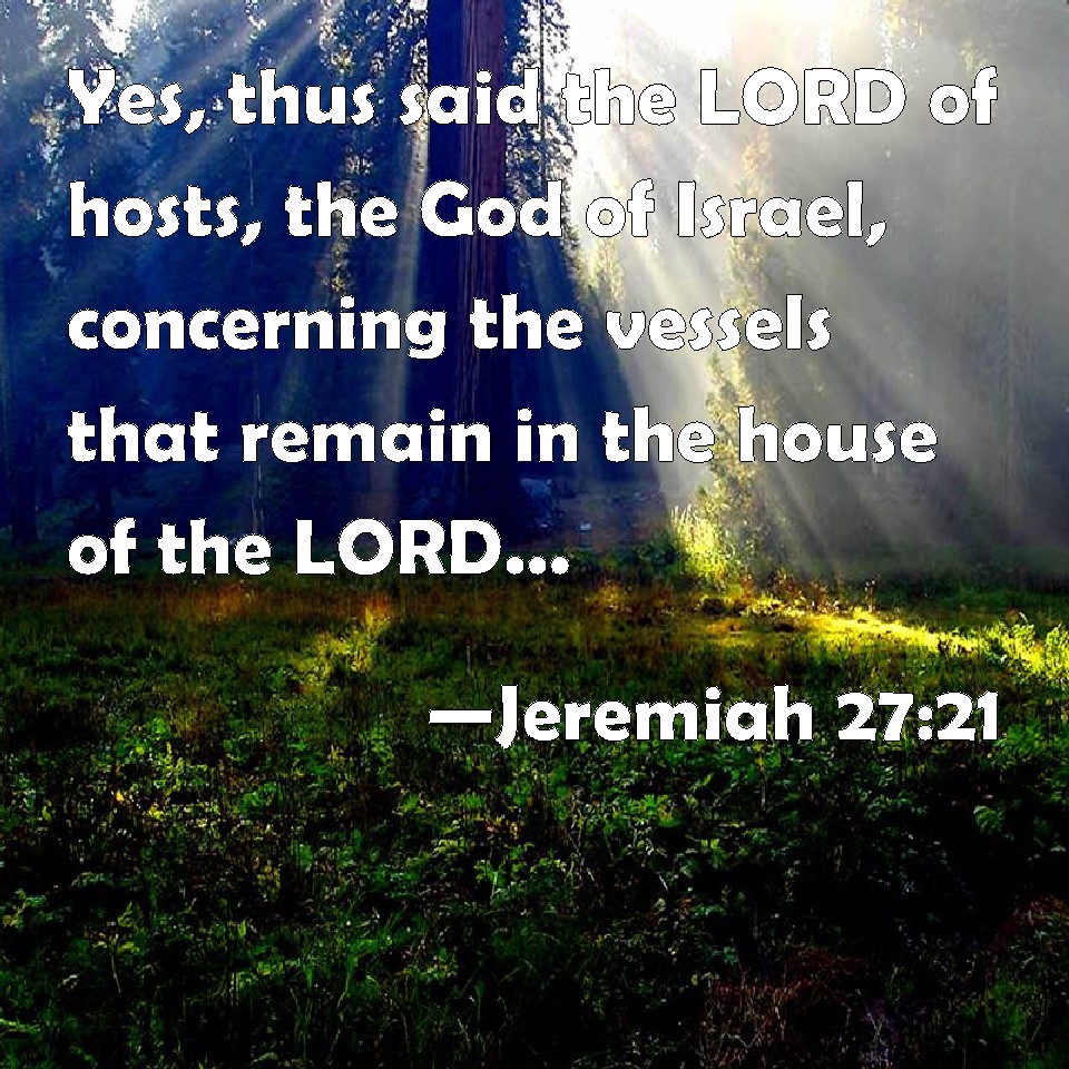 Choose a Background Jeremiah 27:21 Yes, thus said the LORD of hosts, the God of Israel, concerning the vessels that remain in the house of the LORD, and in the house of the king of Judah and of Jerusalem; KJV: Yea, thus saith the LORD of hosts, the God of Israel, concerning the vessels that remain in the house of the LORD, and in the house of the king of Judah and of Jerusalem; DRB: For thus saith the Lord of hosts the God of Israel, to the vessels that are left in the house of the Lord, and in the house of the king of Juda and Jerusalem: DBT: yea, thus saith Jehovah of hosts, the God of Israel, concerning the vessels that are left in the house of Jehovah, and in the house of the king of Judah, and in Jerusalem: ERV: yea, thus saith the LORD of hosts, the God of Israel, concerning the vessels that are left in the house of the LORD, and in the house of the king of Judah, and at Jerusalem: WBT: Yes, thus saith the LORD of hosts, the God of Israel, concerning the vessels that remain in the house of the LORD, and in the house of the king of Judah and of Jerusalem; WEB: yes, thus says Yahweh of Armies, the God of Israel, concerning the vessels that are left in the house of Yahweh, and in the house of the king of Judah, and at Jerusalem: YLT: Surely thus said Jehovah of Hosts, God of Israel, concerning the vessels that are left of the house of Jehovah, and of the house of the king of Judah, and in Jerusalem:Links Jeremiah 27:21 NIV • Jeremiah 27:21 NLT • Jeremiah 27:21 ESV • Jeremiah 27:21 NASB • Jeremiah 27:21 KJV • Jeremiah 27:21 Interlinear • Jeremiah 27:21 Commentaries • Jeremiah 27:21 Parallel Texts • Jeremiah 27:21 Bible Apps • Jeremiah 27:21 Parallel • Bible Hub |