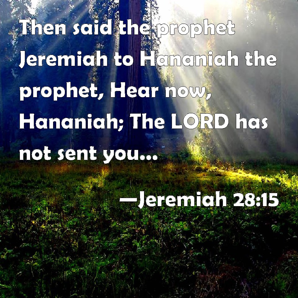 Choose a Background Jeremiah 28:15 Then said the prophet Jeremiah to Hananiah the prophet, Hear now, Hananiah; The LORD has not sent you; but you make this people to trust in a lie. KJV: Then said the prophet Jeremiah unto Hananiah the prophet, Hear now, Hananiah; The LORD hath not sent thee; but thou makest this people to trust in a lie. DRB: And Jeremias the prophet said to Hananias the prophet: Hear now, Hananias: the Lord hath not sent thee, and thou hast made this people to trust in a lie. DBT: And the prophet Jeremiah said unto the prophet Hananiah, Hear now, Hananiah: Jehovah hath not sent thee; and thou makest this people to trust in falsehood. ERV: Then said the prophet Jeremiah unto Hananiah the prophet, Hear now, Hananiah; the LORD hath not sent thee; but thou makest this people to trust in a lie. WBT: Then said the prophet Jeremiah to Hananiah the prophet, Hear now, Hananiah; The LORD hath not sent thee; but thou makest this people to trust in a lie. WEB: Then the prophet Jeremiah said to Hananiah the prophet, Hear now, Hananiah: Yahweh has not sent you; but you make this people to trust in a lie. YLT: And Jeremiah the prophet saith unto Hananiah the prophet, 'Hear, I pray thee, O Hananiah; Jehovah hath not sent thee, and thou hast caused this people to trust on falsehood.Links Jeremiah 28:15 NIV • Jeremiah 28:15 NLT • Jeremiah 28:15 ESV • Jeremiah 28:15 NASB • Jeremiah 28:15 KJV • Jeremiah 28:15 Interlinear • Jeremiah 28:15 Commentaries • Jeremiah 28:15 Parallel Texts • Jeremiah 28:15 Bible Apps • Jeremiah 28:15 Parallel • Bible Hub |