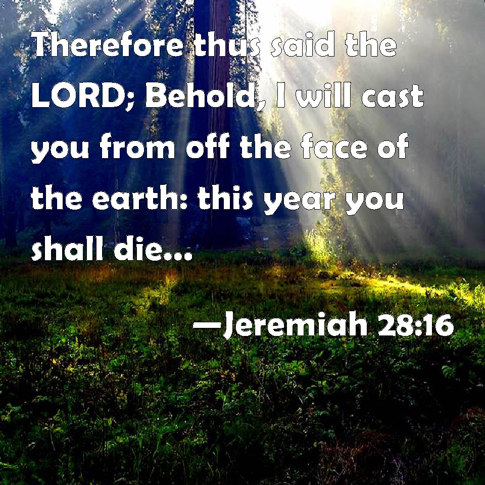 Choose a Background Jeremiah 28:16 Therefore thus said the LORD; Behold, I will cast you from off the face of the earth: this year you shall die, because you have taught rebellion against the LORD. KJV: Therefore thus saith the LORD; Behold, I will cast thee from off the face of the earth: this year thou shalt die, because thou hast taught rebellion against the LORD. DRB: Therefore thus saith the Lord: Behold I will send thee away from off the face of the earth: this year shalt thou die: for thou hast spoken against the Lord. DBT: Therefore thus saith Jehovah: Behold, I will cast thee from off the face of the earth: this year thou shalt die, for thou hast spoken revolt against Jehovah. ERV: Therefore thus saith the LORD, Behold, I will send thee away from off the face of the earth: this year thou shalt die, because thou hast spoken rebellion against the LORD. WBT: Therefore thus saith the LORD; Behold, I will cast thee from off the face of the earth: this year thou shalt die, because thou hast taught rebellion against the LORD. WEB: Therefore thus says Yahweh, Behold, I will send you away from off the surface of the earth: this year you shall die, because you have spoken rebellion against Yahweh. YLT: Therefore thus said Jehovah, Lo, I am casting thee from off the face of the ground; this year thou diest, for apostasy thou hast spoken concerning Jehovah.'Links Jeremiah 28:16 NIV • Jeremiah 28:16 NLT • Jeremiah 28:16 ESV • Jeremiah 28:16 NASB • Jeremiah 28:16 KJV • Jeremiah 28:16 Interlinear • Jeremiah 28:16 Commentaries • Jeremiah 28:16 Parallel Texts • Jeremiah 28:16 Bible Apps • Jeremiah 28:16 Parallel • Bible Hub |