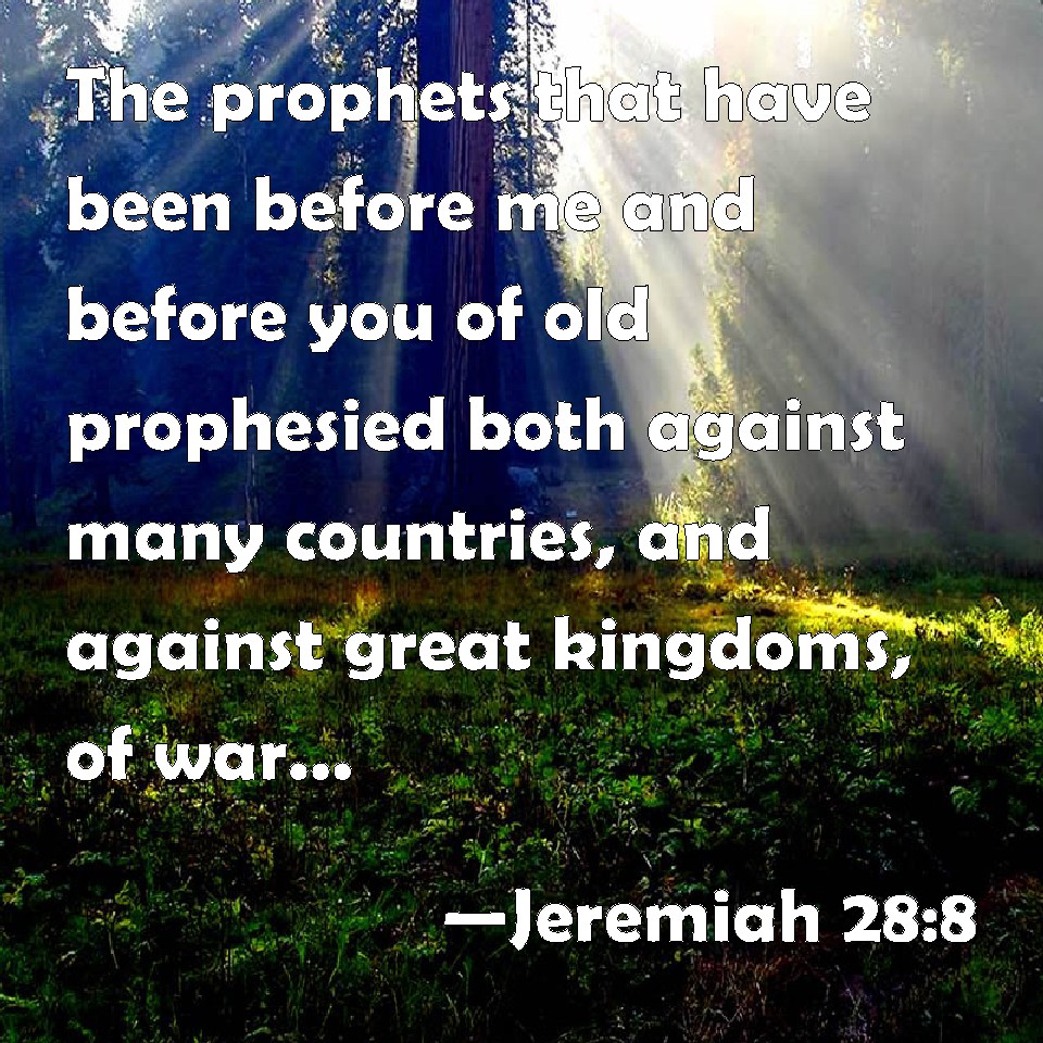 Choose a Background Jeremiah 28:8 The prophets that have been before me and before you of old prophesied both against many countries, and against great kingdoms, of war, and of evil, and of pestilence. KJV: The prophets that have been before me and before thee of old prophesied both against many countries, and against great kingdoms, of war, and of evil, and of pestilence. DRB: The prophets that have been before me, and before thee from the beginning, and have prophesied concerning many countries, and concerning great kingdoms, of war, and of affliction, and of famine. DBT: The prophets that have been before me and before thee of old, prophesied also concerning many countries and concerning great kingdoms, of war, and of evil, and of pestilence. ERV: The prophets that have been before me and before thee of old prophesied against many countries, and against great kingdoms, of war, and of evil, and of pestilence. WBT: The prophets that have been before me and before thee of old prophesied both against many countries, and against great kingdoms, of war, and of evil, and of pestilence. WEB: The prophets who have been before me and before you of old prophesied against many countries, and against great kingdoms, of war, and of evil, and of pestilence. YLT: The prophets who have been before me, and before thee, from of old, even they prophesy concerning many lands, and concerning great kingdoms, of battle, and of evil, and of pestilence.Links Jeremiah 28:8 NIV • Jeremiah 28:8 NLT • Jeremiah 28:8 ESV • Jeremiah 28:8 NASB • Jeremiah 28:8 KJV • Jeremiah 28:8 Interlinear • Jeremiah 28:8 Commentaries • Jeremiah 28:8 Parallel Texts • Jeremiah 28:8 Bible Apps • Jeremiah 28:8 Parallel • Bible Hub |