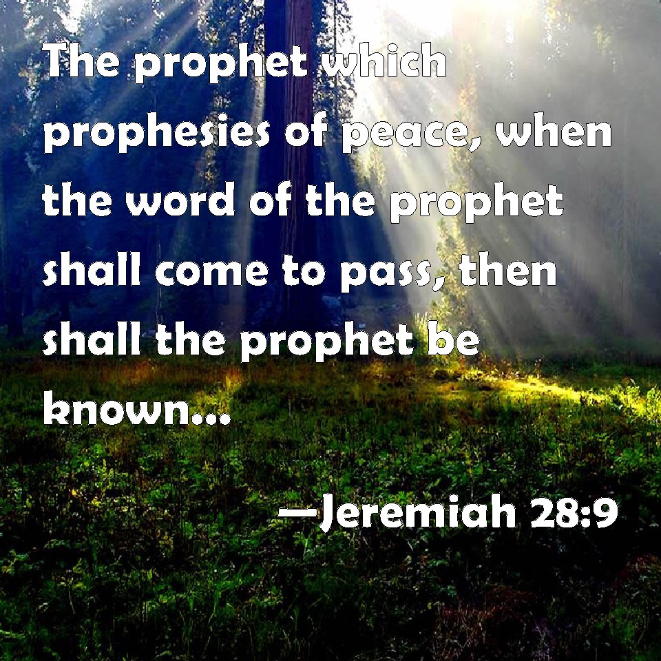 Choose a Background Jeremiah 28:9 The prophet which prophesies of peace, when the word of the prophet shall come to pass, then shall the prophet be known, that the LORD has truly sent him. KJV: The prophet which prophesieth of peace, when the word of the prophet shall come to pass, then shall the prophet be known, that the LORD hath truly sent him. DRB: The prophet that prophesied peace when his word shall come to pass, the prophet shall be known, whom the Lord hath sent in truth. DBT: The prophet that prophesieth of peace, when the word of the prophet shall come to pass, shall be known as the prophet whom Jehovah hath really sent. ERV: The prophet which prophesieth of peace, when the word of the prophet shall come to pass, then shall the prophet be known, that the LORD hath truly sent him. WBT: The prophet who prophesieth of peace, when the word of the prophet shall come to pass, then shall the prophet be known, that the LORD hath truly sent him. WEB: The prophet who prophesies of peace, when the word of the prophet shall happen, then shall the prophet be known, that Yahweh has truly sent him. YLT: The prophet who doth prophesy of peace — by the coming in of the word of the prophet, known is the prophet that Jehovah hath truly sent him.'Links Jeremiah 28:9 NIV • Jeremiah 28:9 NLT • Jeremiah 28:9 ESV • Jeremiah 28:9 NASB • Jeremiah 28:9 KJV • Jeremiah 28:9 Interlinear • Jeremiah 28:9 Commentaries • Jeremiah 28:9 Parallel Texts • Jeremiah 28:9 Bible Apps • Jeremiah 28:9 Parallel • Bible Hub |