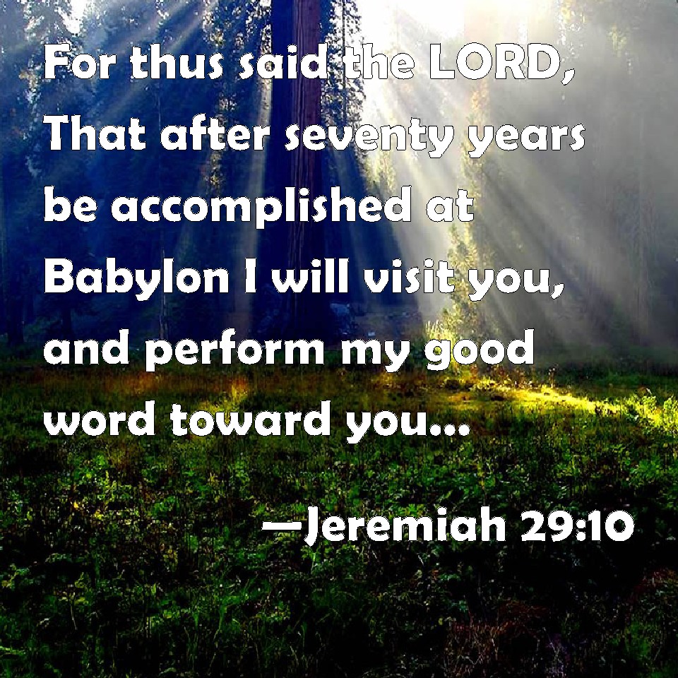 Choose a Background Jeremiah 29:10 For thus said the LORD, That after seventy years be accomplished at Babylon I will visit you, and perform my good word toward you, in causing you to return to this place. KJV: For thus saith the LORD, That after seventy years be accomplished at Babylon I will visit you, and perform my good word toward you, in causing you to return to this place. DRB: For thus saith the Lord: When the seventy years shall begin to be accomplished in Babylon, I will visit you: and I will perform my good word in your favour, to bring you again to this place. DBT: For thus saith Jehovah: When seventy years shall be accomplished for Babylon I will visit you, and perform my good word toward you, in bringing you back to this place. ERV: For thus saith the LORD, After seventy years be accomplished for Babylon, I will visit you, and perform my good word toward you, in causing you to return to this place. WBT: For thus saith the LORD, That after seventy years shall be accomplished at Babylon I will visit you, and perform my good word towards you, in causing you to return to this place. WEB: For thus says Yahweh, After seventy years are accomplished for Babylon, I will visit you, and perform my good word toward you, in causing you to return to this place. YLT: For thus said Jehovah, Surely at the fulness of Babylon — seventy years — I inspect you, and have established towards you My good word, to bring you back unto this place.Links Jeremiah 29:10 NIV • Jeremiah 29:10 NLT • Jeremiah 29:10 ESV • Jeremiah 29:10 NASB • Jeremiah 29:10 KJV • Jeremiah 29:10 Interlinear • Jeremiah 29:10 Commentaries • Jeremiah 29:10 Parallel Texts • Jeremiah 29:10 Bible Apps • Jeremiah 29:10 Parallel • Bible Hub |