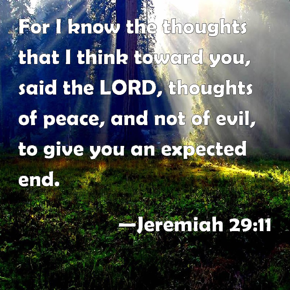 Choose a Background Jeremiah 29:11 For I know the thoughts that I think toward you, said the LORD, thoughts of peace, and not of evil, to give you an expected end. KJV: For I know the thoughts that I think toward you, saith the LORD, thoughts of peace, and not of evil, to give you an expected end. DRB: For I know the thoughts that I think towards you, saith the Lord, thoughts of peace, and not of affliction, to give you an end and patience. DBT: For I know the thoughts that I think toward you, saith Jehovah, thoughts of peace, and not of evil, to give you in your latter end a hope. ERV: For I know the thoughts that I think toward you, saith the LORD, thoughts of peace, and not of evil, to give you hope in your latter end. WBT: For I know the thoughts that I think towards you, saith the LORD, thoughts of peace, and not of evil, to give you an expected end. WEB: For I know the thoughts that I think toward you, says Yahweh, thoughts of peace, and not of evil, to give you hope and a future. YLT: For I have known the thoughts that I am thinking towards you — an affirmation of Jehovah; thoughts of peace, and not of evil, to give to you posterity and hope.Links Jeremiah 29:11 NIV • Jeremiah 29:11 NLT • Jeremiah 29:11 ESV • Jeremiah 29:11 NASB • Jeremiah 29:11 KJV • Jeremiah 29:11 Interlinear • Jeremiah 29:11 Commentaries • Jeremiah 29:11 Parallel Texts • Jeremiah 29:11 Bible Apps • Jeremiah 29:11 Parallel • Bible Hub |