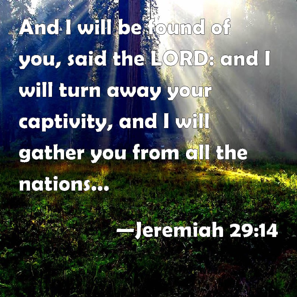 Choose a Background Jeremiah 29:14 And I will be found of you, said the LORD: and I will turn away your captivity, and I will gather you from all the nations, and from all the places where I have driven you, said the LORD; and I will bring you again into the place from where I caused you to be carried away captive. KJV: And I will be found of you, saith the LORD: and I will turn away your captivity, and I will gather you from all the nations, and from all the places whither I have driven you, saith the LORD; and I will bring you again into the place whence I caused you to be carried away captive. DRB: And I will be found by you, saith the Lord: and I will bring back your captivity, and I will gather you out of all nations, and from all the places to which I have driven you out, saith the Lord: and I will bring you back from the place to which I caused you to be carried away captive. DBT: and I will be found of you, saith Jehovah. And I will turn your captivity, and I will gather you from all the nations, and from all the places whither I have driven you, saith Jehovah; and I will bring you again into the place whence I have caused you to be carried away captive. ERV: And I will be found of you, saith the LORD, and I will turn again your captivity, and I will gather you from all the nations, and from all the places whither I have driven you, saith the LORD; and I will bring you again unto the place whence I caused you to be carried away captive. WBT: And I will be found by you, saith the LORD: and I will turn away your captivity, and I will gather you from all the nations, and from all the places whither I have driven you, saith the LORD: and I will bring you again into the place whence I caused you to be carried away captive. WEB: I will be found by you, says Yahweh, and I will turn again your captivity, and I will gather you from all the nations, and from all the places where I have driven you, says Yahweh; and I will bring you again to the place from where I caused you to be carried away captive. YLT: And I have been found of you — an affirmation of Jehovah; and I have turned back to your captivity, and have gathered you out of all the nations, and out of all the places whither I have driven you — an affirmation of Jehovah — and I have brought you back unto the place whence I removed you.Links Jeremiah 29:14 NIV • Jeremiah 29:14 NLT • Jeremiah 29:14 ESV • Jeremiah 29:14 NASB • Jeremiah 29:14 KJV • Jeremiah 29:14 Interlinear • Jeremiah 29:14 Commentaries • Jeremiah 29:14 Parallel Texts • Jeremiah 29:14 Bible Apps • Jeremiah 29:14 Parallel • Bible Hub |