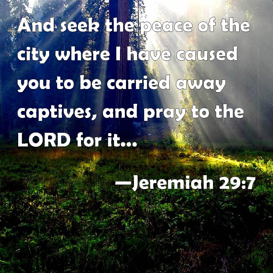 And seek the peace of the city, to which I have caused you to be carried away captives; and pray to the Lord for it: for in the peace thereof shall be your peace.