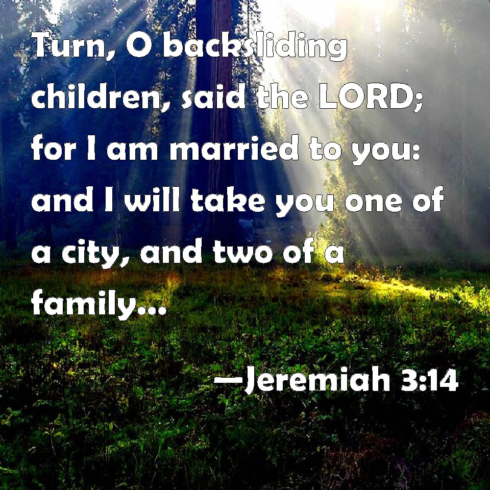 Choose a Background Jeremiah 3:14 Turn, O backsliding children, said the LORD; for I am married to you: and I will take you one of a city, and two of a family, and I will bring you to Zion: KJV: Turn, O backsliding children, saith the LORD; for I am married unto you: and I will take you one of a city, and two of a family, and I will bring you to Zion: DRB: Return, O ye revolting children, saith the Lord: for I am your husband: and I will take you, one of a city, and two of a kindred, and will bring you into Sion. DBT: Return, backsliding children, saith Jehovah; for I am a husband unto you, and I will take you, one of a city, and two of a family, and I will bring you to Zion. ERV: Return, O backsliding children, saith the LORD; for I am a husband unto you: and I will take you one of a city, and two of a family, and I will bring you to Zion: WBT: Turn, O backsliding children, saith the LORD; for I am married to you: and I will take you one of a city, and two of a family, and I will bring you to Zion: WEB: "Return, backsliding children," says Yahweh; "for I am a husband to you. I will take you one of a city, and two of a family, and I will bring you to Zion. YLT: Turn back, O backsliding sons, An affirmation of Jehovah. For I have ruled over you, And taken you one of a city, and two of a family, And have brought you to Zion,Links Jeremiah 3:14 NIV • Jeremiah 3:14 NLT • Jeremiah 3:14 ESV • Jeremiah 3:14 NASB • Jeremiah 3:14 KJV • Jeremiah 3:14 Interlinear • Jeremiah 3:14 Commentaries • Jeremiah 3:14 Parallel Texts • Jeremiah 3:14 Bible Apps • Jeremiah 3:14 Parallel • Bible Hub |