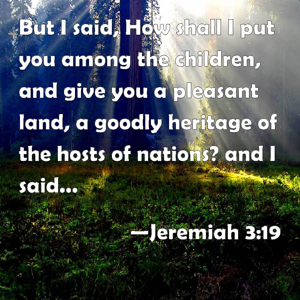 Choose a Background Jeremiah 3:19 But I said, How shall I put you among the children, and give you a pleasant land, a goodly heritage of the hosts of nations? and I said, You shall call me, My father; and shall not turn away from me. KJV: But I said, How shall I put thee among the children, and give thee a pleasant land, a goodly heritage of the hosts of nations? and I said, Thou shalt call me, My father; and shalt not turn away from me. DRB: But I said: How shall I put thee among the children, and give thee a lovely land, the goodly inheritance of the armies of the Gentiles? And I said: Thou shalt call me father and shalt cease to walk after me. DBT: And as for me, I said, How shall I put thee among the children, and give thee the pleasant land, the goodly inheritance of the hosts of the nations? And I said, Thou shalt call me, My father; and shalt not turn away from following me. ERV: But I said, How shall I put thee among the children, and give thee a pleasant land, a goodly heritage of the hosts of the nations? and I said, Ye shall call me My father; and shall not turn away from following me. WBT: But I said, How shall I put thee among the children, and give thee a pleasant land, a goodly heritage of the hosts of nations? and I said, Thou shalt call me, My father; and shalt not turn away from me. WEB: "But I said, 'How I would put you among the children, and give you a pleasant land, a goodly heritage of the armies of the nations!' and I said, 'You shall call me "My Father," and shall not turn away from following me.' YLT: And I have said, How do I put thee among the sons, And give to thee a desirable land, A beauteous inheritance of the hosts of nations, And I say, My father — ye do call to Me, And from after Me ye do not turn back.Links Jeremiah 3:19 NIV • Jeremiah 3:19 NLT • Jeremiah 3:19 ESV • Jeremiah 3:19 NASB • Jeremiah 3:19 KJV • Jeremiah 3:19 Interlinear • Jeremiah 3:19 Commentaries • Jeremiah 3:19 Parallel Texts • Jeremiah 3:19 Bible Apps • Jeremiah 3:19 Parallel • Bible Hub |