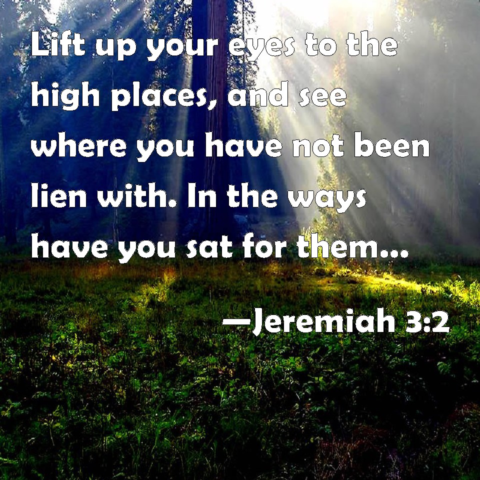 Choose a Background Jeremiah 3:2 Lift up your eyes to the high places, and see where you have not been lien with. In the ways have you sat for them, as the Arabian in the wilderness; and you have polluted the land with your prostitutions and with your wickedness. KJV: Lift up thine eyes unto the high places, and see where thou hast not been lien with. In the ways hast thou sat for them, as the Arabian in the wilderness; and thou hast polluted the land with thy whoredoms and with thy wickedness. DRB: Lift up thy eyes on high: and see where thou hast not prostuted thyself: Thou didst sit in the ways, waiting for them as a robber in the wilderness: and thou hast polluted the land with thy fornications, and with thy wickedness. DBT: Lift up thine eyes unto the heights and see, where hast thou not been lain with? In the ways hast thou sat for them, as an Arab in the wilderness; and thou hast polluted the land with thy fornications and with thy wickedness. ERV: Lift up thine eyes unto the bare heights, and see; where hast thou not been lain with? By the ways hast thou sat for them, as an Arabian in the wilderness; and thou hast polluted the land with thy whoredoms and with thy wickedness. WBT: Lift up thy eyes to the high places, and see where thou hast not been lain with. In the ways hast thou sat for them, as the Arabian in the wilderness; and thou hast polluted the land with thy acts of lewdness, and with thy wickedness. WEB: "Lift up your eyes to the bare heights, and see! Where have you not been lain with? You have sat for them by the ways, as an Arabian in the wilderness. You have polluted the land with your prostitution and with your wickedness. YLT: Lift thine eyes to the high places, and see, Where hast thou not been lain with? On the ways thou hast sat for them, As an Arab in a wilderness, And thou defilest the land, By thy fornications, and by thy wickedness.Links Jeremiah 3:2 NIV • Jeremiah 3:2 NLT • Jeremiah 3:2 ESV • Jeremiah 3:2 NASB • Jeremiah 3:2 KJV • Jeremiah 3:2 Interlinear • Jeremiah 3:2 Commentaries • Jeremiah 3:2 Parallel Texts • Jeremiah 3:2 Bible Apps • Jeremiah 3:2 Parallel • Bible Hub |