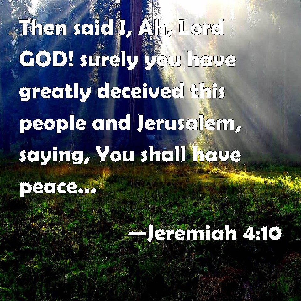 Choose a Background Jeremiah 4:10 Then said I, Ah, Lord GOD! surely you have greatly deceived this people and Jerusalem, saying, You shall have peace; whereas the sword reaches to the soul. KJV: Then said I, Ah, Lord GOD! surely thou hast greatly deceived this people and Jerusalem, saying, Ye shall have peace; whereas the sword reacheth unto the soul. DRB: And I said: Alas, alas, alas, O Lord God, hast thou then deceived this people and Jerusalem, saying: You shall have peace: and behold the sword reacheth even to the soul? DBT: And I said, Alas, Lord Jehovah! surely thou hast greatly deceived this people and Jerusalem, saying, Ye shall have peace; whereas the sword reacheth unto the soul. ERV: Then said I, Ah, Lord GOD! surely thou hast greatly deceived this people and Jerusalem, saying, Ye shall have peace; whereas the sword reacheth unto the soul. WBT: Then said I, Ah, Lord GOD! surely thou hast greatly deceived this people and Jerusalem, saying, Ye shall have peace; whereas the sword reacheth to the soul. WEB: Then I said, "Ah, Lord Yahweh! Surely you have greatly deceived this people and Jerusalem, saying, 'You shall have peace;' whereas the sword reaches to the heart." YLT: And I say, 'Ah, Lord Jehovah, Surely thou hast entirely forgotten this people and Jerusalem, saying, Peace is for you, And struck hath a sword unto the soul!'Links Jeremiah 4:10 NIV • Jeremiah 4:10 NLT • Jeremiah 4:10 ESV • Jeremiah 4:10 NASB • Jeremiah 4:10 KJV • Jeremiah 4:10 Interlinear • Jeremiah 4:10 Commentaries • Jeremiah 4:10 Parallel Texts • Jeremiah 4:10 Bible Apps • Jeremiah 4:10 Parallel • Bible Hub |