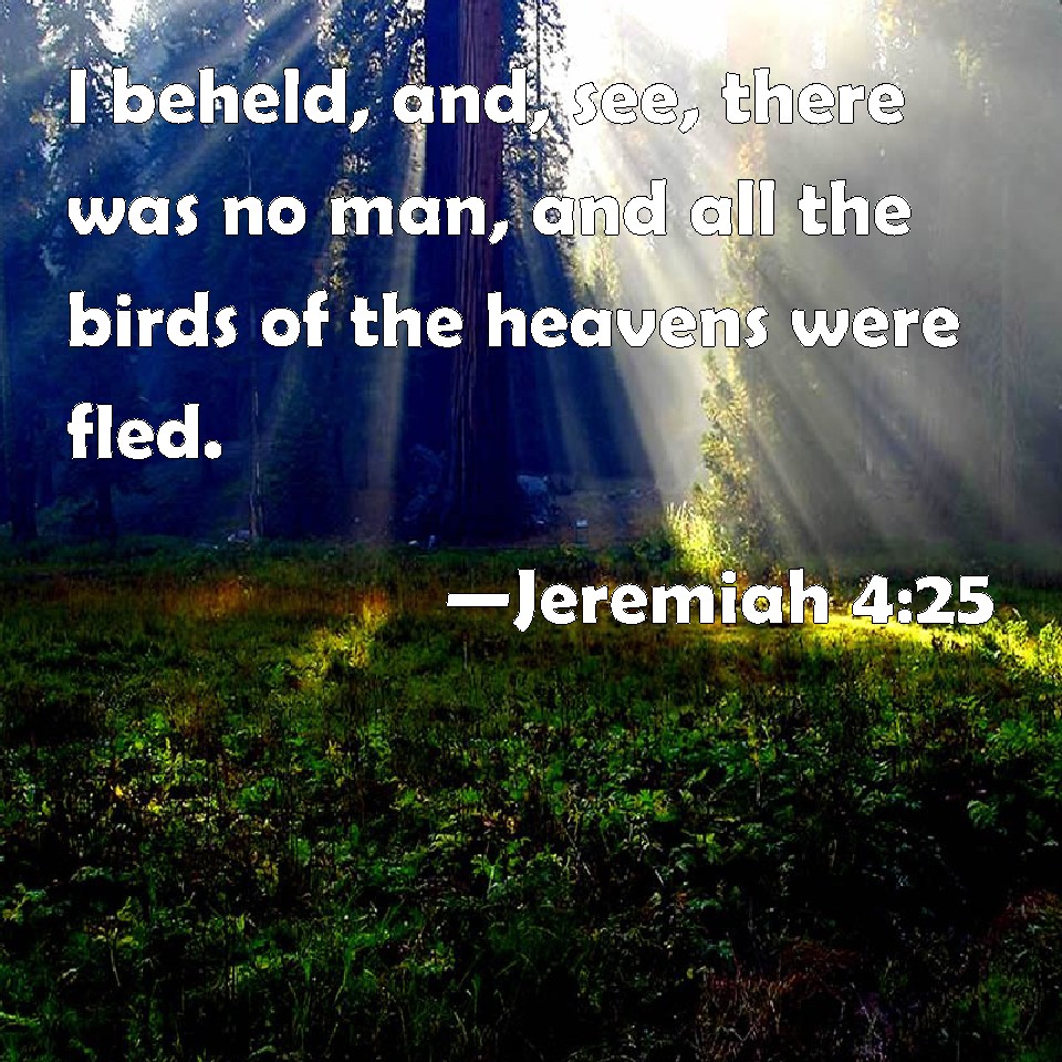 Choose a Background Jeremiah 4:25 I beheld, and, see, there was no man, and all the birds of the heavens were fled. KJV: I beheld, and, lo, there was no man, and all the birds of the heavens were fled. DRB: I beheld, and lo there was no man: and all the birds of the air were gone. DBT: I beheld, and lo, man was not, and all the fowl of the heavens were fled. ERV: I beheld, and, lo, there was no man, and all the birds of the heavens were fled. WBT: I beheld, and lo, there was no man, and all the fowls of the heavens had fled. WEB: I saw, and behold, there was no man, and all the birds of the sky had fled. YLT: I have looked, and lo, man is not, And all fowls of the heavens have fled.Links Jeremiah 4:25 NIV • Jeremiah 4:25 NLT • Jeremiah 4:25 ESV • Jeremiah 4:25 NASB • Jeremiah 4:25 KJV • Jeremiah 4:25 Interlinear • Jeremiah 4:25 Commentaries • Jeremiah 4:25 Parallel Texts • Jeremiah 4:25 Bible Apps • Jeremiah 4:25 Parallel • Bible Hub |