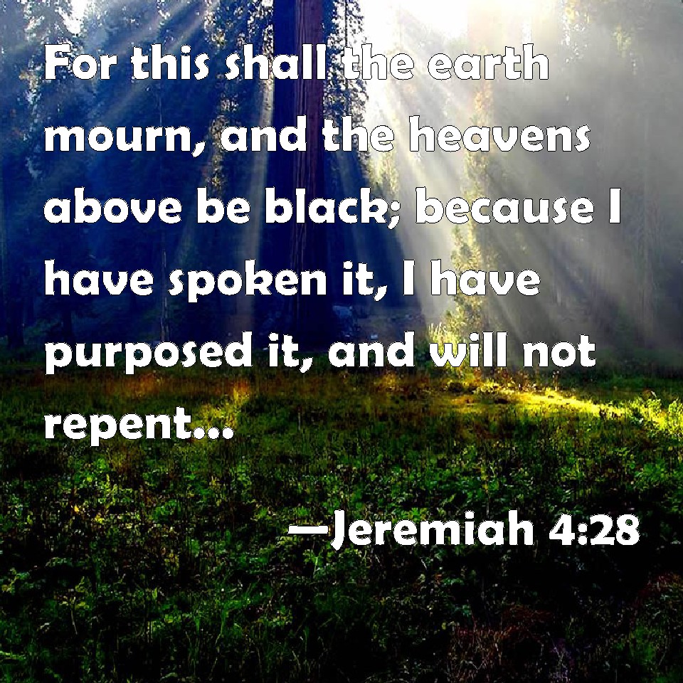 Choose a Background Jeremiah 4:28 For this shall the earth mourn, and the heavens above be black; because I have spoken it, I have purposed it, and will not repent, neither will I turn back from it. KJV: For this shall the earth mourn, and the heavens above be black: because I have spoken it, I have purposed it, and will not repent, neither will I turn back from it. DRB: The earth shall mourn, and the heavens shall lament from above: because I have spoken, I have purposed, and I have not repented, neither am I turned away from it. DBT: For this shall the earth mourn, and the heavens above be black; because I have spoken it, I have purposed it, and will not repent, neither will I turn back therefrom. ERV: For this shall the earth mourn, and the heavens above be black: because I have spoken it, I have purposed it, and I have not repented, neither will I turn back from it. WBT: For this shall the earth mourn, and the heavens above be black: because I have spoken it, I have purposed it, and will not repent, neither will I turn back from it. WEB: For this the earth will mourn, and the heavens above be black; because I have spoken it, I have purposed it, and I have not repented, neither will I turn back from it." YLT: For this doth the land mourn, And black have been the heavens above, because I have spoken — I have purposed, And I have not repented, Nor do I turn back from it.Links Jeremiah 4:28 NIV • Jeremiah 4:28 NLT • Jeremiah 4:28 ESV • Jeremiah 4:28 NASB • Jeremiah 4:28 KJV • Jeremiah 4:28 Interlinear • Jeremiah 4:28 Commentaries • Jeremiah 4:28 Parallel Texts • Jeremiah 4:28 Bible Apps • Jeremiah 4:28 Parallel • Bible Hub |