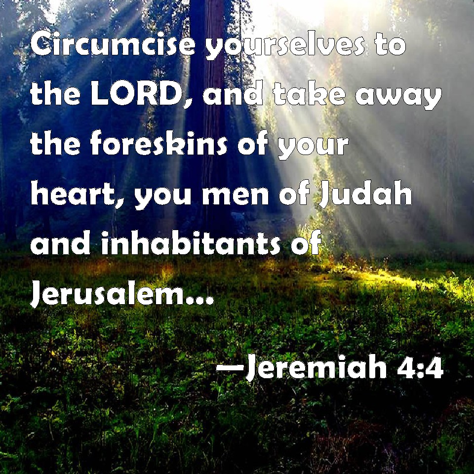 Choose a Background Jeremiah 4:4 Circumcise yourselves to the LORD, and take away the foreskins of your heart, you men of Judah and inhabitants of Jerusalem: lest my fury come forth like fire, and burn that none can quench it, because of the evil of your doings. KJV: Circumcise yourselves to the LORD, and take away the foreskins of your heart, ye men of Judah and inhabitants of Jerusalem: lest my fury come forth like fire, and burn that none can quench it, because of the evil of your doings. DRB: Be circumcised to the Lord, and take away the foreskins of your hearts, ye men of Juda, and ye inhabitants of Jerusalem: lest my indignation come forth like fire, and burn, and there be none that can quench it: because of the wickedness of your thoughts. DBT: Circumcise yourselves for Jehovah, and take away the foreskins of your heart, ye men of Judah and inhabitants of Jerusalem; lest my fury come forth like fire and burn, and there be none to quench it, because of the evil of your doings. ERV: Circumcise yourselves to the LORD, and take away the foreskins of your heart, ye men of Judah and inhabitants of Jerusalem: lest my fury go forth like fire, and burn that none can quench it, because of the evil of your doings. WBT: Circumcise yourselves to the LORD, and take away the foreskins of your heart, ye men of Judah and inhabitants of Jerusalem: lest my fury come forth like fire, and burn that none can quench it, because of the evil of your doings. WEB: Circumcise yourselves to Yahweh, and take away the foreskins of your heart, you men of Judah and inhabitants of Jerusalem; lest my wrath go forth like fire, and burn so that none can quench it, because of the evil of your doings. YLT: Be circumcised to Jehovah, And turn aside the foreskins of your heart, O man of Judah, and ye inhabitants of Jerusalem, Lest My fury go out as fire, and hath burned, And there is none quenching, Because of the evil of your doings.Links Jeremiah 4:4 NIV • Jeremiah 4:4 NLT • Jeremiah 4:4 ESV • Jeremiah 4:4 NASB • Jeremiah 4:4 KJV • Jeremiah 4:4 Interlinear • Jeremiah 4:4 Commentaries • Jeremiah 4:4 Parallel Texts • Jeremiah 4:4 Bible Apps • Jeremiah 4:4 Parallel • Bible Hub |