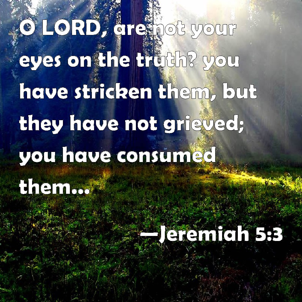 Choose a Background Jeremiah 5:3 O LORD, are not your eyes on the truth? you have stricken them, but they have not grieved; you have consumed them, but they have refused to receive correction: they have made their faces harder than a rock; they have refused to return. KJV: O LORD, are not thine eyes upon the truth? thou hast stricken them, but they have not grieved; thou hast consumed them, but they have refused to receive correction: they have made their faces harder than a rock; they have refused to return. DRB: O Lord, thy eyes are upon truth: thou hast struck them, and they have not grieved: thou hast bruised them, and they have refused to receive correction: they have made their faces harder than the rock, and they have refused to return. DBT: Jehovah, are not thine eyes upon fidelity? Thou hast smitten them, but they are not sore; thou hast consumed them, they have refused to receive correction: they have made their faces harder than a rock; they have refused to return. ERV: O LORD, do not thine eyes look upon truth? thou hast stricken them, but they were not grieved; thou hast consumed them, but they have refused to receive correction: they have made their faces harder than a rock; they have refused to return. WBT: O LORD, are not thy eyes upon the truth? thou hast stricken them, but they have not grieved; thou hast consumed them, but they have refused to receive correction: they have made their faces harder than a rock; they have refused to return. WEB: O Yahweh, don't your eyes look on truth? You have stricken them, but they were not grieved. You have consumed them, but they have refused to receive correction. They have made their faces harder than a rock. They have refused to return. YLT: Jehovah, Thine eyes, are they not on stedfastness? Thou hast smitten them, and they have not grieved, Thou hast consumed them, They have refused to receive instruction, They made their faces harder than a rock, They have refused to turn back.Links Jeremiah 5:3 NIV • Jeremiah 5:3 NLT • Jeremiah 5:3 ESV • Jeremiah 5:3 NASB • Jeremiah 5:3 KJV • Jeremiah 5:3 Interlinear • Jeremiah 5:3 Commentaries • Jeremiah 5:3 Parallel Texts • Jeremiah 5:3 Bible Apps • Jeremiah 5:3 Parallel • Bible Hub |