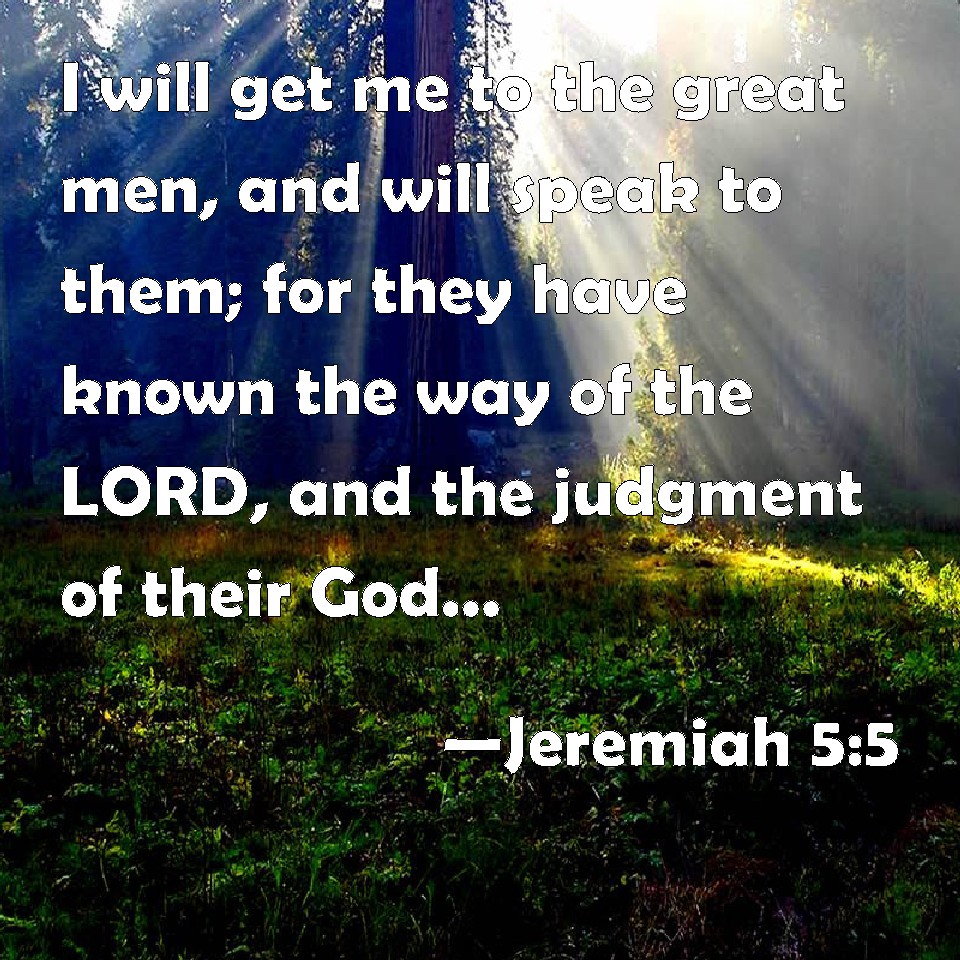 Choose a Background Jeremiah 5:5 I will get me to the great men, and will speak to them; for they have known the way of the LORD, and the judgment of their God: but these have altogether broken the yoke, and burst the bonds. KJV: I will get me unto the great men, and will speak unto them; for they have known the way of the LORD, and the judgment of their God: but these have altogether broken the yoke, and burst the bonds. DRB: I will go therefore to the great men, and I will speak to them: for they known the way of the Lord, the judgement of their God: and behold these have together broken the yoke more, and have burst the bonds. DBT: I will go unto the great men, and will speak unto them; for they know the way of Jehovah, the judgment of their God; but these have altogether broken the yoke, have burst the bonds. ERV: I will get me unto the great men, and will speak unto them; for they know the way of the LORD, and the judgment of their God. But these with one accord have broken the yoke, and burst the bands. WBT: I will go to the great men, and will speak to them; for they have known the way of the LORD, and the judgment of their God: but these have altogether broken the yoke, and burst the bonds. WEB: I will go to the great men, and will speak to them; for they know the way of Yahweh, and the law of their God." But these with one accord have broken the yoke, and burst the bonds. YLT: I get me to the great, and I speak with them, For they have known the way of Jehovah, The judgment of their God.' Surely they together have broken the yoke, They have drawn away the bands.Links Jeremiah 5:5 NIV • Jeremiah 5:5 NLT • Jeremiah 5:5 ESV • Jeremiah 5:5 NASB • Jeremiah 5:5 KJV • Jeremiah 5:5 Interlinear • Jeremiah 5:5 Commentaries • Jeremiah 5:5 Parallel Texts • Jeremiah 5:5 Bible Apps • Jeremiah 5:5 Parallel • Bible Hub |