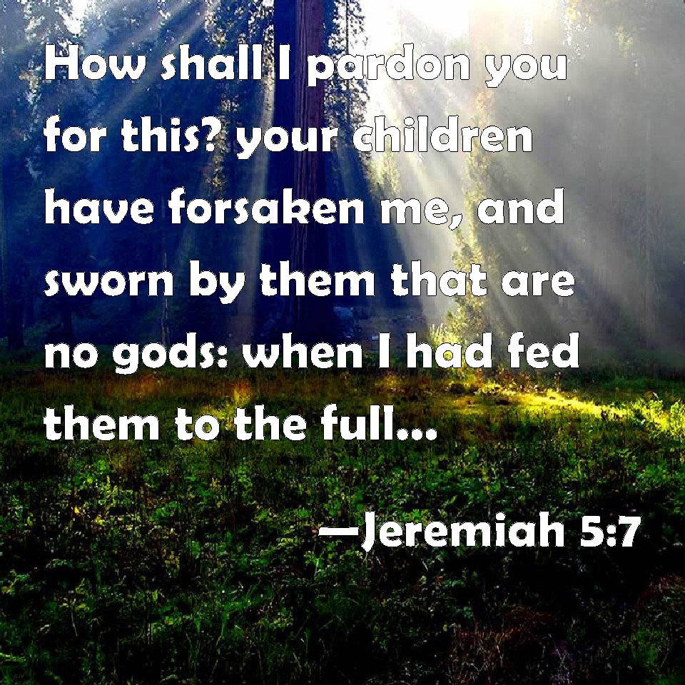 Jeremiah 5:7 How shall I pardon you for this? your children have forsaken me, and sworn by them that are no gods: when I had fed them to the full, they then committed adultery, and assembled themselves by troops in the harlots' houses.