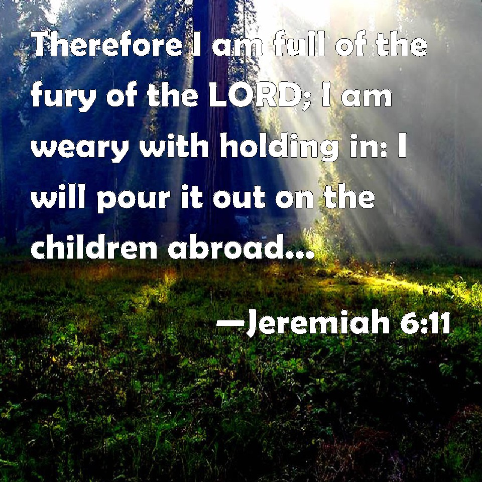 Choose a Background Jeremiah 6:11 Therefore I am full of the fury of the LORD; I am weary with holding in: I will pour it out on the children abroad, and on the assembly of young men together: for even the husband with the wife shall be taken, the aged with him that is full of days. KJV: Therefore I am full of the fury of the LORD; I am weary with holding in: I will pour it out upon the children abroad, and upon the assembly of young men together: for even the husband with the wife shall be taken, the aged with him that is full of days. DRB: Therefore am I full of the fury of the Lord, I am weary with holding in: pour it out upon the child abroad, and upon the council of the young men together: for man and woman shall be taken, the ancient and he that is full of days. DBT: And I am full of the fury of Jehovah, I am weary with holding in. Pour it out upon the children in the street, and upon the assembly of young men together: for even the husband with the wife shall be taken; the aged with him that is full of days. ERV: Therefore I am full of the fury of the LORD; I am weary with holding in: pour it out upon the children in the street, and upon the assembly of young men together: for even the husband with the wife shall be taken, the aged with him that is full of days. WBT: Therefore I am full of the fury of the LORD; I am weary with holding in: I will pour it out upon the children abroad, and upon the assembly of young men together: for even the husband with the wife shall be taken, the aged with him that is full of days. WEB: Therefore I am full of the wrath of Yahweh. I am weary with holding in. "Pour it out on the children in the street, and on the assembly of young men together; for even the husband with the wife shall be taken, the aged with him who is full of days. YLT: And with the fury of Jehovah I have been filled, (I have been weary of containing,) To pour it on the suckling in the street, And on the assembly of youths together, For even husband with wife are captured, An elder with one full of days,Links Jeremiah 6:11 NIV • Jeremiah 6:11 NLT • Jeremiah 6:11 ESV • Jeremiah 6:11 NASB • Jeremiah 6:11 KJV • Jeremiah 6:11 Interlinear • Jeremiah 6:11 Commentaries • Jeremiah 6:11 Parallel Texts • Jeremiah 6:11 Bible Apps • Jeremiah 6:11 Parallel • Bible Hub |