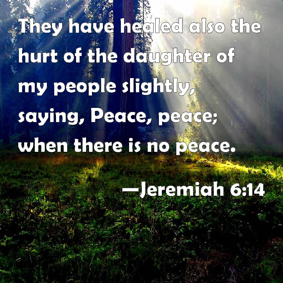 Choose a Background Jeremiah 6:14 They have healed also the hurt of the daughter of my people slightly, saying, Peace, peace; when there is no peace. KJV: They have healed also the hurt of the daughter of my people slightly, saying, Peace, peace; when there is no peace. DRB: And they healed the breach of the daughter of my people disgracefully, saying: Peace, peace: and there was no peace. DBT: And they have healed the breach of the daughter of my people lightly, saying, Peace, peace! when there is no peace. ERV: They have healed also the hurt of my people lightly, saying, Peace, peace; when there is no peace. WBT: They have healed also the hurt of the daughter of my people slightly, saying, Peace, peace; when there is no peace. WEB: They have healed also the hurt of my people superficially, saying, 'Peace, peace!' when there is no peace. YLT: And they heal the breach of the daughter of my people slightly, Saying, 'Peace, peace!' and there is no peace.Links Jeremiah 6:14 NIV • Jeremiah 6:14 NLT • Jeremiah 6:14 ESV • Jeremiah 6:14 NASB • Jeremiah 6:14 KJV • Jeremiah 6:14 Interlinear • Jeremiah 6:14 Commentaries • Jeremiah 6:14 Parallel Texts • Jeremiah 6:14 Bible Apps • Jeremiah 6:14 Parallel • Bible Hub |