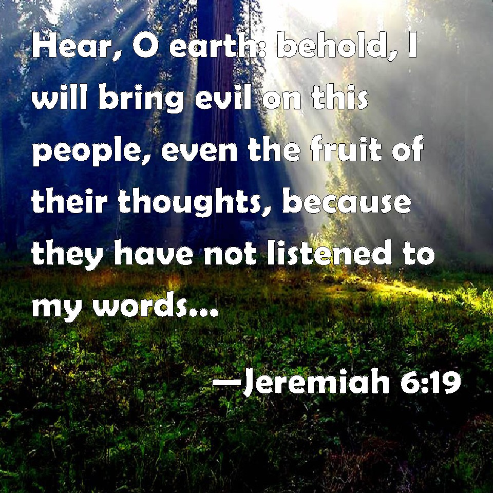 Choose a Background Jeremiah 6:19 Hear, O earth: behold, I will bring evil on this people, even the fruit of their thoughts, because they have not listened to my words, nor to my law, but rejected it. KJV: Hear, O earth: behold, I will bring evil upon this people, even the fruit of their thoughts, because they have not hearkened unto my words, nor to my law, but rejected it. DRB: Hear, O earth: Behold I will bring evils upon this people, the fruits of their own thoughts: because they have not heard my words, and they have cast away my law. DBT: Hear, O earth: behold, I will bring evil upon this people, the fruit of their thoughts; for they have not hearkened unto my words, and as to my law, they have rejected it. ERV: Hear, O earth: behold, I will bring evil upon this people, even the fruit of their thoughts, because they have not hearkened unto my words; and as for my law, they have rejected it. WBT: Hear, O earth: behold, I will bring evil upon this people, even the fruit of their thoughts, because they have not hearkened to my words, nor to my law, but have rejected it. WEB: Hear, earth! Behold, I will bring evil on this people, even the fruit of their thoughts, because they have not listened to my words; and as for my law, they have rejected it. YLT: Hear, O earth, lo, I am bringing evil on this people, The fruit of their devices, For to My words they gave no attention, And My law — they kick against it.Links Jeremiah 6:19 NIV • Jeremiah 6:19 NLT • Jeremiah 6:19 ESV • Jeremiah 6:19 NASB • Jeremiah 6:19 KJV • Jeremiah 6:19 Interlinear • Jeremiah 6:19 Commentaries • Jeremiah 6:19 Parallel Texts • Jeremiah 6:19 Bible Apps • Jeremiah 6:19 Parallel • Bible Hub |