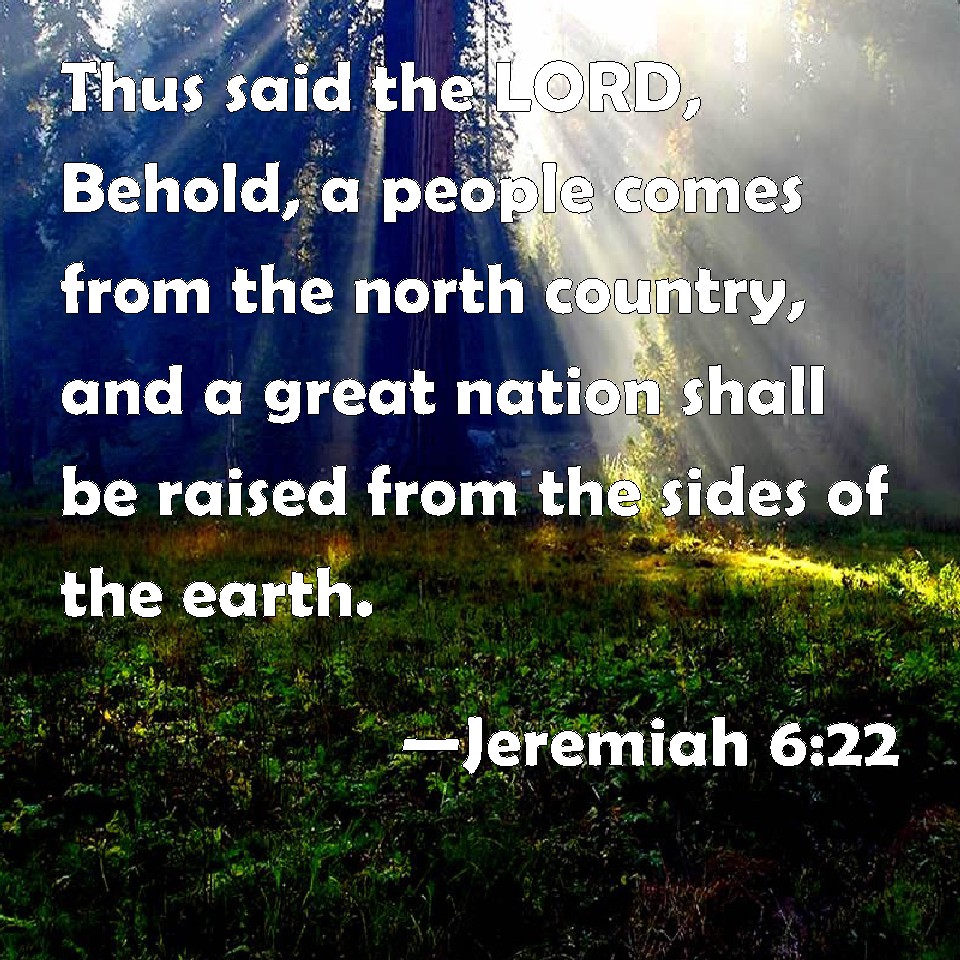 Choose a Background Jeremiah 6:22 Thus said the LORD, Behold, a people comes from the north country, and a great nation shall be raised from the sides of the earth. KJV: Thus saith the LORD, Behold, a people cometh from the north country, and a great nation shall be raised from the sides of the earth. DRB: Thus saith the Lord: Behold a people cometh from the land of the north, and a great nation shall rise up from the ends of the earth. DBT: Thus saith Jehovah: Behold, a people cometh from the north country, and a great nation is stirred up from the uttermost parts of the earth. ERV: Thus saith the LORD, Behold, a people cometh from the north country; and a great nation shall be stirred up from the uttermost parts of the earth. WBT: Thus saith the LORD, Behold, a people cometh from the north country, and a great nation shall be raised from the sides of the earth. WEB: Thus says Yahweh, "Behold, a people comes from the north country. A great nation shall be stirred up from the uttermost parts of the earth. YLT: Thus said Jehovah: Lo, a people hath come from a north country, And a great nation is stirred up from the sides of the earth.Links Jeremiah 6:22 NIV • Jeremiah 6:22 NLT • Jeremiah 6:22 ESV • Jeremiah 6:22 NASB • Jeremiah 6:22 KJV • Jeremiah 6:22 Interlinear • Jeremiah 6:22 Commentaries • Jeremiah 6:22 Parallel Texts • Jeremiah 6:22 Bible Apps • Jeremiah 6:22 Parallel • Bible Hub |