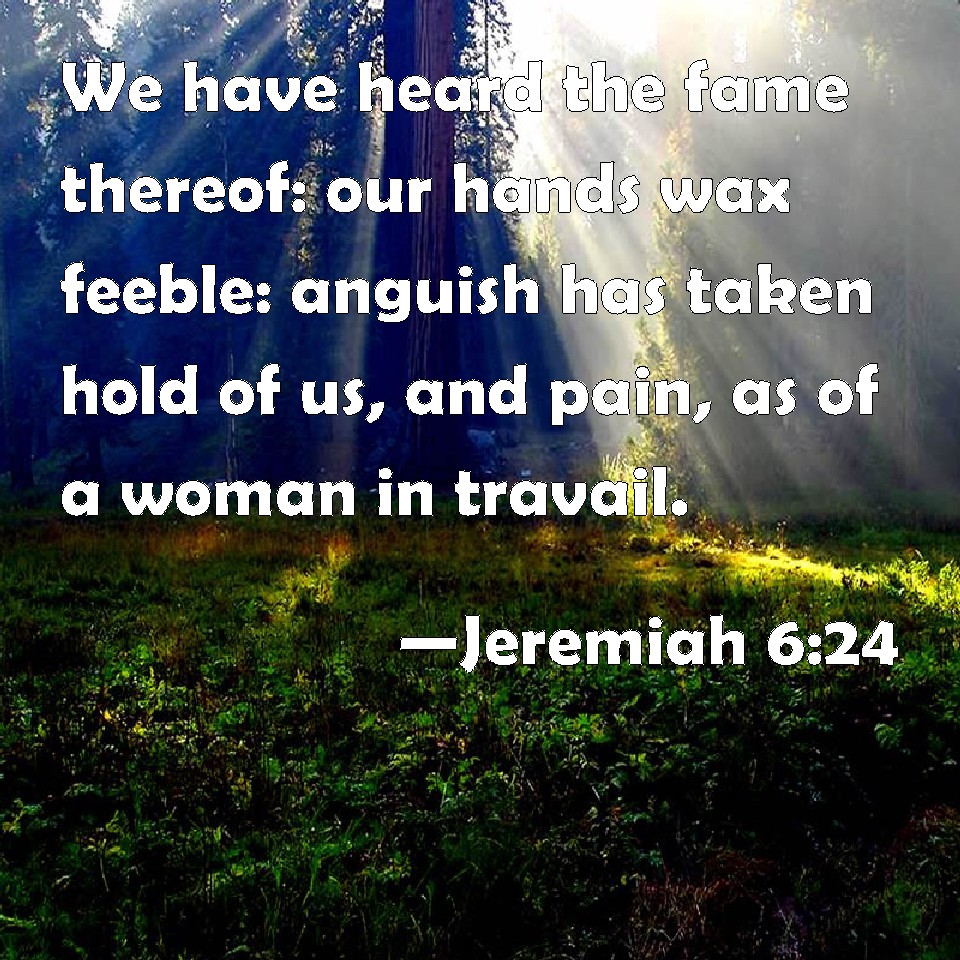 Choose a Background Jeremiah 6:24 We have heard the fame thereof: our hands wax feeble: anguish has taken hold of us, and pain, as of a woman in travail. KJV: We have heard the fame thereof: our hands wax feeble: anguish hath taken hold of us, and pain, as of a woman in travail. DRB: We have heard the fame thereof, our hands grow feeble: anguish hath taken hold of us, as a woman in labor. DBT: We have heard the report thereof: our hands are grown feeble; anguish hath taken hold of us, pain as of a woman that travaileth. ERV: We have heard the fame thereof; our hands wax feeble: anguish hath taken hold of us, and pangs as of a woman in travail. WBT: We have heard the fame of it: our hands become feeble: anguish hath taken hold of us, and pain, as of a woman in travail. WEB: We have heard its report; our hands wax feeble: anguish has taken hold of us, [and] pangs as of a woman in travail. YLT: 'We have heard its sound, feeble have been our hands, Distress hath seized us, pain as of a travailing woman.Links Jeremiah 6:24 NIV • Jeremiah 6:24 NLT • Jeremiah 6:24 ESV • Jeremiah 6:24 NASB • Jeremiah 6:24 KJV • Jeremiah 6:24 Interlinear • Jeremiah 6:24 Commentaries • Jeremiah 6:24 Parallel Texts • Jeremiah 6:24 Bible Apps • Jeremiah 6:24 Parallel • Bible Hub |