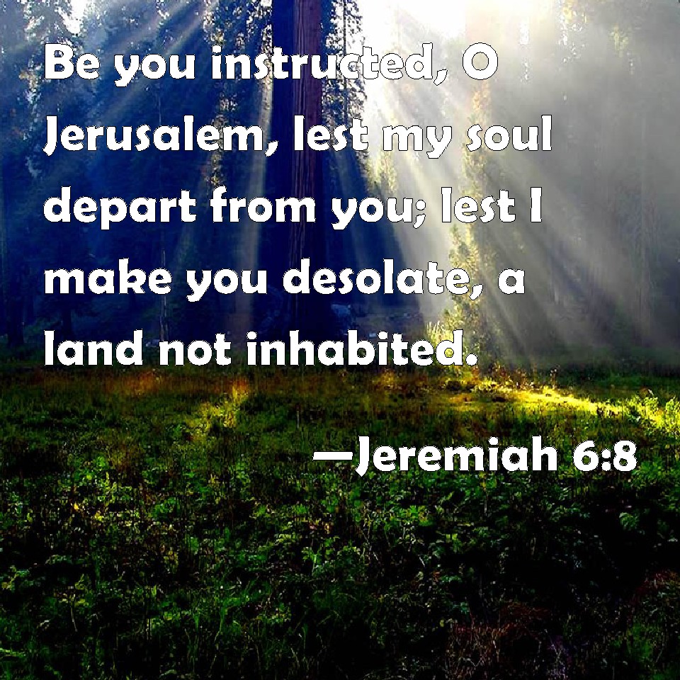 Choose a Background Jeremiah 6:8 Be you instructed, O Jerusalem, lest my soul depart from you; lest I make you desolate, a land not inhabited. KJV: Be thou instructed, O Jerusalem, lest my soul depart from thee; lest I make thee desolate, a land not inhabited. DRB: Be thou instructed, O Jerusalem, lest my soul depart from thee, lest I make thee desolate, a land uninhabited. DBT: Be thou instructed, Jerusalem, lest my soul be alienated from thee; lest I make thee a desolation, a land not inhabited. ERV: Be thou instructed, O Jerusalem, lest my soul be alienated from thee; lest I make thee a desolation, a land not inhabited. WBT: Be thou instructed, O Jerusalem, lest my soul depart from thee; lest I make thee desolate, a land not inhabited. WEB: Be instructed, Jerusalem, lest my soul be alienated from you; lest I make you a desolation, a land not inhabited." YLT: Be instructed, O Jerusalem, Lest My soul be alienated from thee, Lest I make thee a desolation, a land not inhabited.Links Jeremiah 6:8 NIV • Jeremiah 6:8 NLT • Jeremiah 6:8 ESV • Jeremiah 6:8 NASB • Jeremiah 6:8 KJV • Jeremiah 6:8 Interlinear • Jeremiah 6:8 Commentaries • Jeremiah 6:8 Parallel Texts • Jeremiah 6:8 Bible Apps • Jeremiah 6:8 Parallel • Bible Hub |