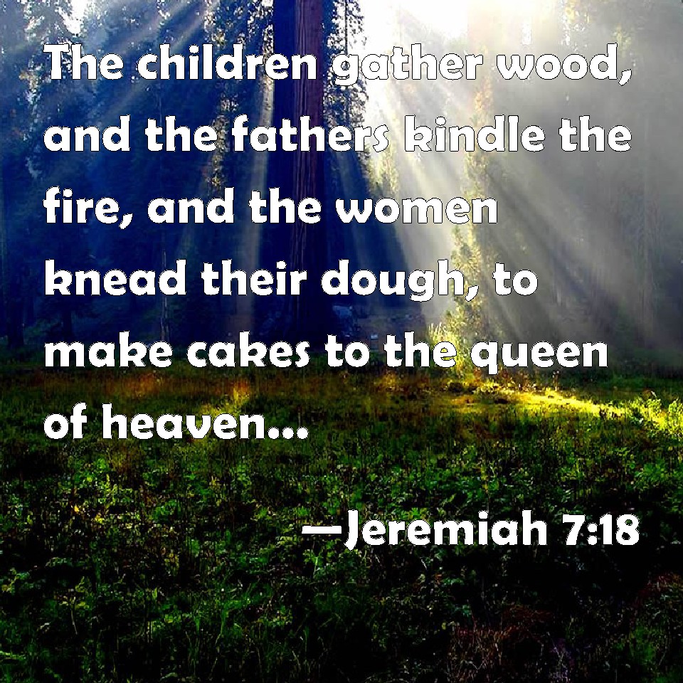 Choose a Background Jeremiah 7:18 The children gather wood, and the fathers kindle the fire, and the women knead their dough, to make cakes to the queen of heaven, and to pour out drink offerings to other gods, that they may provoke me to anger. KJV: The children gather wood, and the fathers kindle the fire, and the women knead their dough, to make cakes to the queen of heaven, and to pour out drink offerings unto other gods, that they may provoke me to anger. DRB: The children gather wood, and the fathers kindle the fire and the women knead the dough, to make cakes to the queen of heaven, and to offer libations to strange gods, and to provoke me to anger. DBT: The children gather wood, and the fathers kindle the fire, and the women knead dough, to make cakes to the queen of heaven, and to pour out drink-offerings unto other gods, that they may provoke me to anger. ERV: The children gather wood, and the fathers kindle the fire, and the women knead the dough, to make cakes to the queen of heaven, and to pour out drink offerings unto other gods, that they may provoke me to anger. WBT: The children gather wood, and the fathers kindle the fire, and the women knead dough, to make cakes to the queen of heaven, and to pour out drink-offerings to other gods, that they may provoke me to anger. WEB: The children gather wood, and the fathers kindle the fire, and the women knead the dough, to make cakes to the queen of the sky, and to pour out drink offerings to other gods, that they may provoke me to anger. YLT: The sons are gathering wood, And the fathers are causing the fire to burn, And the women are kneading dough, To make cakes to the queen of the heavens, And to pour out libations to other gods, So as to provoke Me to anger.Links Jeremiah 7:18 NIV • Jeremiah 7:18 NLT • Jeremiah 7:18 ESV • Jeremiah 7:18 NASB • Jeremiah 7:18 KJV • Jeremiah 7:18 Interlinear • Jeremiah 7:18 Commentaries • Jeremiah 7:18 Parallel Texts • Jeremiah 7:18 Bible Apps • Jeremiah 7:18 Parallel • Bible Hub |