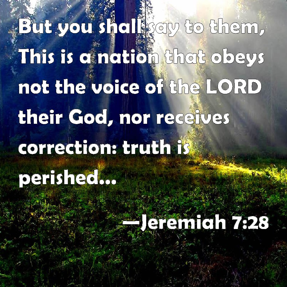 Choose a Background Jeremiah 7:28 But you shall say to them, This is a nation that obeys not the voice of the LORD their God, nor receives correction: truth is perished, and is cut off from their mouth. KJV: But thou shalt say unto them, This is a nation that obeyeth not the voice of the LORD their God, nor receiveth correction: truth is perished, and is cut off from their mouth. DRB: And thou shalt say to them: This is a nation which hath not hearkened to the voice of the Lord their God, nor received instruction: Faith is lost, and is carried away out of their mouth. DBT: And thou shalt say unto them, This is the nation which hath not hearkened unto the voice of Jehovah their God, nor received correction; fidelity is perished, and is cut off from their mouth. ERV: And thou shalt say unto them, This is the nation that hath not hearkened to the voice of the LORD their God, nor received instruction: truth is perished, and is cut off from their mouth. WBT: But thou shalt say to them, This is a nation that obeyeth not the voice of the LORD their God, nor receiveth correction: truth hath perished, and is cut off from their mouth. WEB: You shall tell them, This is the nation that has not listened to the voice of Yahweh their God, nor received instruction: truth is perished, and is cut off from their mouth. YLT: And thou hast said unto them: This is the nation that hath not hearkened, To the voice of Jehovah its God, Nor have they accepted instruction, Perished hath stedfastness, Yea, it hath been cut off from their mouth.Links Jeremiah 7:28 NIV • Jeremiah 7:28 NLT • Jeremiah 7:28 ESV • Jeremiah 7:28 NASB • Jeremiah 7:28 KJV • Jeremiah 7:28 Interlinear • Jeremiah 7:28 Commentaries • Jeremiah 7:28 Parallel Texts • Jeremiah 7:28 Bible Apps • Jeremiah 7:28 Parallel • Bible Hub |