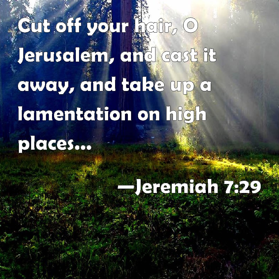 Choose a Background Jeremiah 7:29 Cut off your hair, O Jerusalem, and cast it away, and take up a lamentation on high places; for the LORD has rejected and forsaken the generation of his wrath. KJV: Cut off thine hair, O Jerusalem, and cast it away, and take up a lamentation on high places; for the LORD hath rejected and forsaken the generation of his wrath. DRB: Cut off thy hair, and cast it away: and take up a lamentation on high: for the Lord hath rejected and forsaken the generation of his wrath, DBT: Cut off thy hair, and cast it away, and take up a lamentation on the heights; for Jehovah hath rejected and forsaken the generation of his wrath. ERV: Cut off thine hair, O Jerusalem, and cast it away, and take up a lamentation on the bare heights; for the LORD hath rejected and forsaken the generation of his wrath. WBT: Cut off thy hair, O Jerusalem, and cast it away, and take up a lamentation on high places; for the LORD hath rejected and forsaken the generation of his wrath. WEB: Cut off your hair, [Jerusalem], and cast it away, and take up a lamentation on the bare heights; for Yahweh has rejected and forsaken the generation of his wrath. YLT: Cut off thy crown, and cast it away, And lift up on high places lamentation, For Jehovah hath rejected, And He leaveth the generation of His wrath.Links Jeremiah 7:29 NIV • Jeremiah 7:29 NLT • Jeremiah 7:29 ESV • Jeremiah 7:29 NASB • Jeremiah 7:29 KJV • Jeremiah 7:29 Interlinear • Jeremiah 7:29 Commentaries • Jeremiah 7:29 Parallel Texts • Jeremiah 7:29 Bible Apps • Jeremiah 7:29 Parallel • Bible Hub |