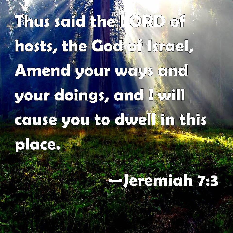 Choose a Background Jeremiah 7:3 Thus said the LORD of hosts, the God of Israel, Amend your ways and your doings, and I will cause you to dwell in this place. KJV: Thus saith the LORD of hosts, the God of Israel, Amend your ways and your doings, and I will cause you to dwell in this place. DRB: Thus saith the Lord of hosts the God of Israel: Make your ways and your doings good: and I will dwell with you in this place. DBT: Thus saith Jehovah of hosts, the God of Israel: Amend your ways and your doings, and I will cause you to dwell in this place. ERV: Thus saith the LORD of hosts, the God of Israel, Amend your ways and your doings, and I will cause you to dwell in this place. WBT: Thus saith the LORD of hosts, the God of Israel, Amend your ways and your doings, and I will cause you to dwell in this place. WEB: Thus says Yahweh of Armies, the God of Israel, Amend your ways and your doings, and I will cause you to dwell in this place. YLT: Thus said Jehovah of Hosts, God of Israel, Amend your ways, and your doings, And I cause you to dwell in this place.Links Jeremiah 7:3 NIV • Jeremiah 7:3 NLT • Jeremiah 7:3 ESV • Jeremiah 7:3 NASB • Jeremiah 7:3 KJV • Jeremiah 7:3 Interlinear • Jeremiah 7:3 Commentaries • Jeremiah 7:3 Parallel Texts • Jeremiah 7:3 Bible Apps • Jeremiah 7:3 Parallel • Bible Hub |