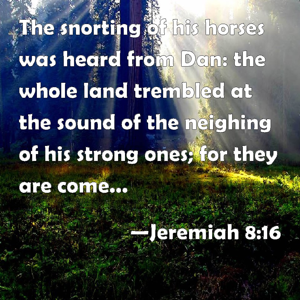 Choose a Background Jeremiah 8:16 The snorting of his horses was heard from Dan: the whole land trembled at the sound of the neighing of his strong ones; for they are come, and have devoured the land, and all that is in it; the city, and those that dwell therein. KJV: The snorting of his horses was heard from Dan: the whole land trembled at the sound of the neighing of his strong ones; for they are come, and have devoured the land, and all that is in it; the city, and those that dwell therein. DRB: The snorting of his horse was heard from Dan, all the land was moved at the sound of the neighing of his warriors: and they came and devoured the land, and all that was in it: the city and its inhabitants. DBT: The snorting of his horses is heard from Dan: the whole land trembleth at the sound of the neighing of his steeds, and they come, and devour the land, and all it contains, the city and those that dwell therein. ERV: The snorting of his horses is heard from Dan: at the sound of the neighing of his strong ones the whole land trembleth; for they are come, and have devoured the land and all that is in it; the city and those that dwell therein. WBT: The snorting of his horses was heard from Dan: the whole land trembled at the sound of the neighing of his strong ones; for they have come, and have devoured the land, and all that is in it; the city, and those that dwell therein. WEB: The snorting of his horses is heard from Dan: at the sound of the neighing of his strong ones the whole land trembles; for they are come, and have devoured the land and all that is in it; the city and those who dwell therein. YLT: From Dan hath been heard the snorting of his horses, From the voice of the neighings of his mighty ones, Trembled hath all the land, And they come in and consume the land and its fulness, The city and the inhabitants in it.Links Jeremiah 8:16 NIV • Jeremiah 8:16 NLT • Jeremiah 8:16 ESV • Jeremiah 8:16 NASB • Jeremiah 8:16 KJV • Jeremiah 8:16 Interlinear • Jeremiah 8:16 Commentaries • Jeremiah 8:16 Parallel Texts • Jeremiah 8:16 Bible Apps • Jeremiah 8:16 Parallel • Bible Hub |