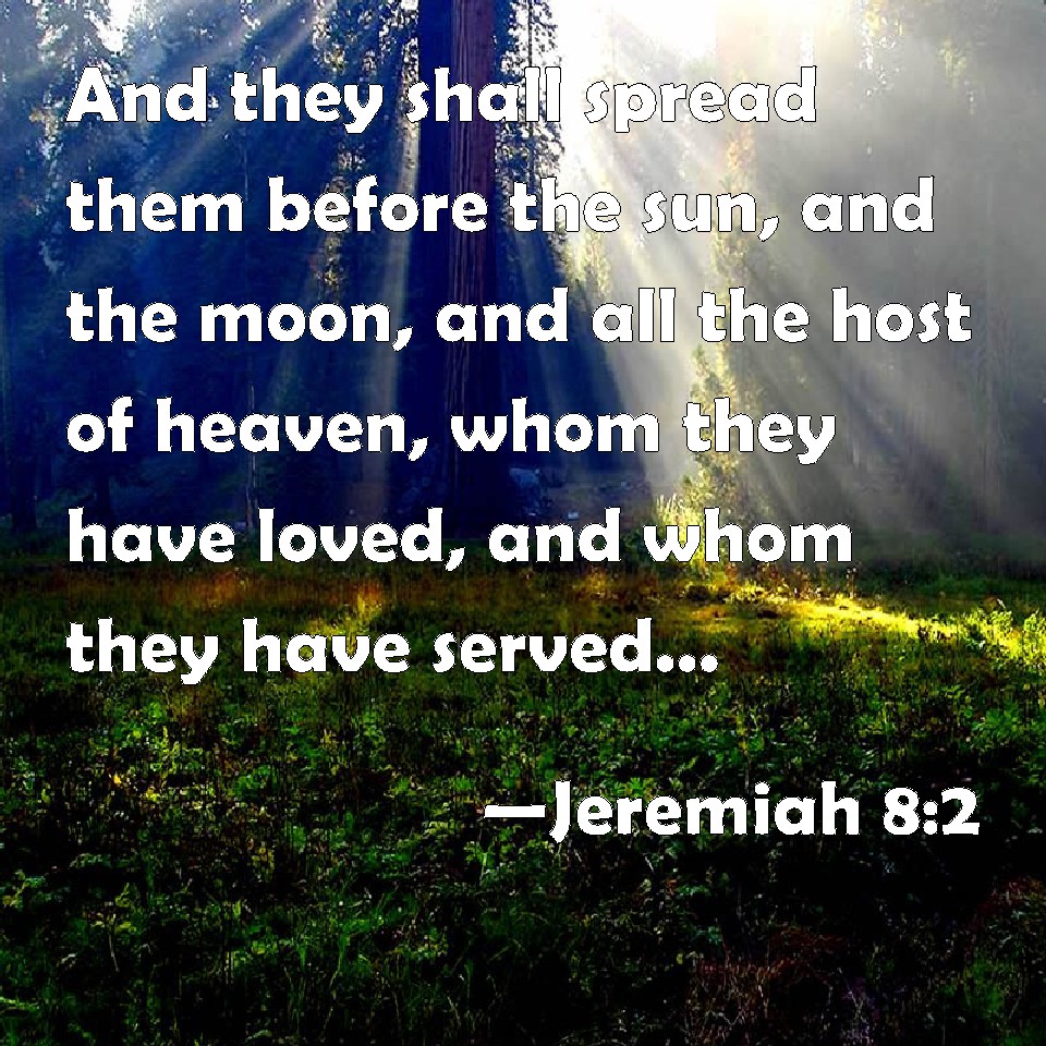 Choose a Background Jeremiah 8:2 And they shall spread them before the sun, and the moon, and all the host of heaven, whom they have loved, and whom they have served, and after whom they have walked, and whom they have sought, and whom they have worshipped: they shall not be gathered, nor be buried; they shall be for dung on the face of the earth. KJV: And they shall spread them before the sun, and the moon, and all the host of heaven, whom they have loved, and whom they have served, and after whom they have walked, and whom they have sought, and whom they have worshipped: they shall not be gathered, nor be buried; they shall be for dung upon the face of the earth. DRB: And they shall spread them abroad to the sun, and the moon, and all the host of heaven, whom they have loved, and whom they have served, and after whom they have walked, and whom they have sought, and adored: they shall not be gathered, and they shall not be buried: they shall be as dung upon the face of the earth. DBT: and they shall spread them out to the sun and to the moon and to all the host of the heavens, which they have loved, and which they have served, and after which they have walked, and which they have sought, and which they have worshipped: they shall not be gathered, nor be buried; they shall be for dung upon the face of the ground. ERV: and they shall spread them before the sun, and the moon, and all the host of heaven, whom they have loved, and whom they have served, and after whom they have walked, and whom they have sought, and whom they have worshipped: they shall not be gathered, nor be buried; they shall be for dung upon the face of the earth. WBT: And they shall spread them before the sun, and the moon, and all the host of heaven, whom they have loved, and whom they have served, and after whom they have walked, and whom they have sought, and whom they have worshiped: they shall not be gathered, nor be buried; they shall be for dung upon the face of the earth. WEB: and they shall spread them before the sun, and the moon, and all the army of the sky, which they have loved, and which they have served, and after which they have walked, and which they have sought, and which they have worshiped: they shall not be gathered, nor be buried, they shall be for dung on the surface of the earth. YLT: And have spread them to sun, and to moon, And to all the host of the heavens, that they have loved, And that they have served, And that they have walked after, And that they have sought, And to which they have bowed themselves, They are not gathered, nor buried, They are for dung on the face of the ground.Links Jeremiah 8:2 NIV • Jeremiah 8:2 NLT • Jeremiah 8:2 ESV • Jeremiah 8:2 NASB • Jeremiah 8:2 KJV • Jeremiah 8:2 Interlinear • Jeremiah 8:2 Commentaries • Jeremiah 8:2 Parallel Texts • Jeremiah 8:2 Bible Apps • Jeremiah 8:2 Parallel • Bible Hub |
